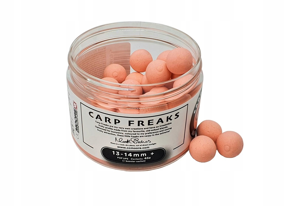 Після більш ніж 2 років розробки з Марком Пітчерсом, CC Moore з гордістю представляє нову лінійку Carp Freaks Pop Up! Ці дивовижні спливаючі вікна засновані на суміші стилів «старої школи», які успішно використовував сам Марк з початку 90-х, які були ретельно відтворені з декількома сучасними нюансами. Прекрасне поєднання фруктів і вершків справді унікальне, і результати випробувань були приголомшливими з багатьма великими коропами, виловленими у Великобританії.
