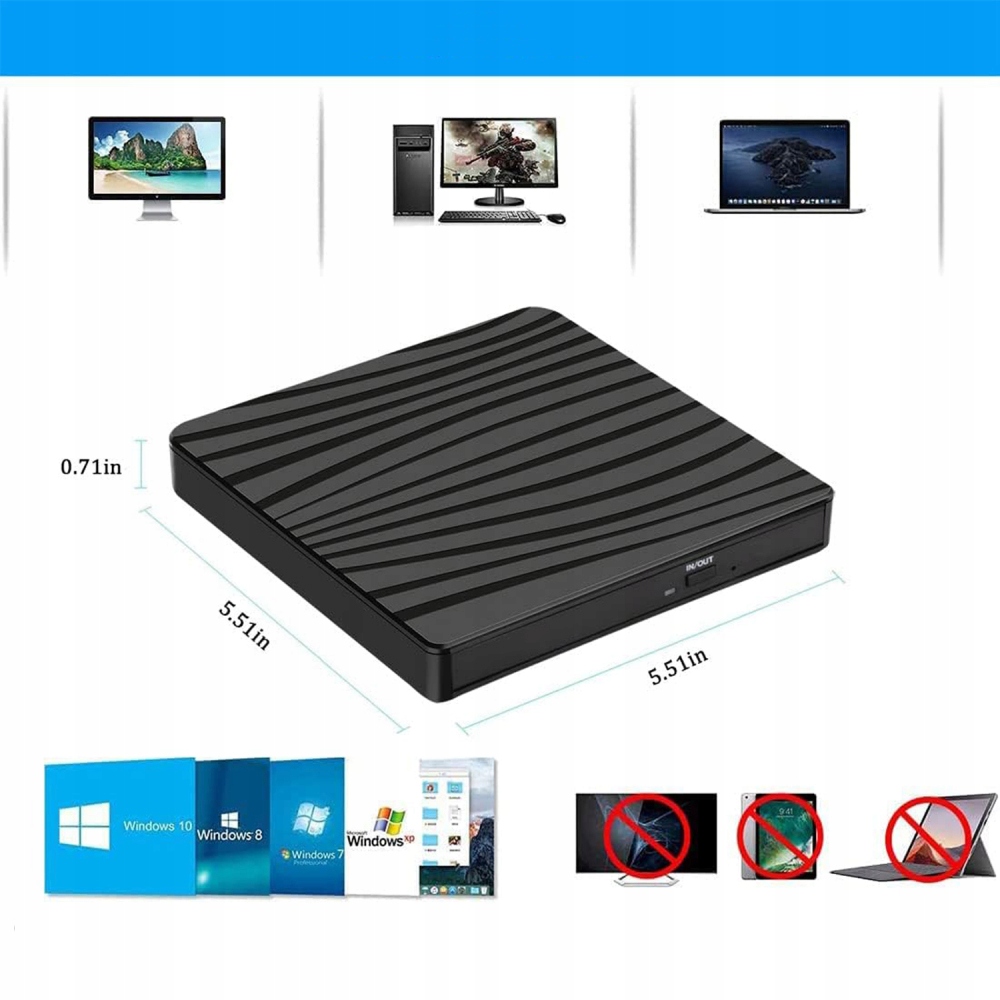 Цей ультратонкий і легкий зовнішній пристрій для запису DVD має вбудований кабель. Вбудована конструкція кабелю, кабелі нелегко втратити. Він стандартно постачається з фізичною кнопкою виймання, тож вам не доведеться турбуватися про те, що ваш диск застрягне в цьому пристрої для запису DVD/CD. Цей зовнішній компакт-диск для вашого ноутбука легко носити чи зберігати вдома чи під час подорожі.