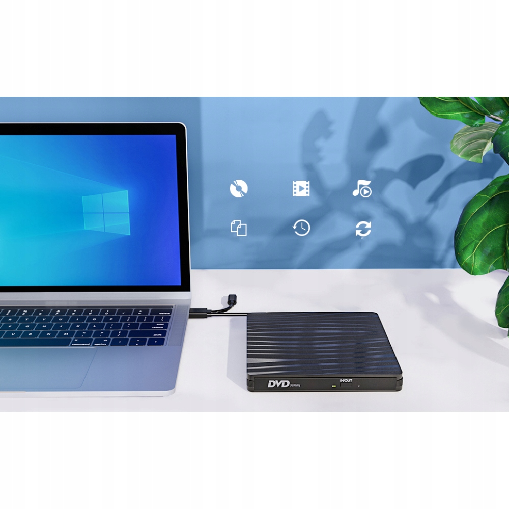 Зовнішній привід компакт-дисків підтримує будь-який ноутбук або настільний комп’ютер із портом USB або C, DVD-відео, CD-R/RW, CD-ROM/XA, CD-ROM, CD-EXTRA, CD-текст. Крім того, підтримуються DVD-R, DVD+R, DVD-RW, DVD+RW, DVD+R DL, DVD-R DL і DVD-RAM. Максимальна швидкість читання DVD — 8x, максимальна швидкість читання CD — 24x, максимальна швидкість запису CD — 24x. Ефективне виправлення помилок, амортизація та технологія зменшення шуму.