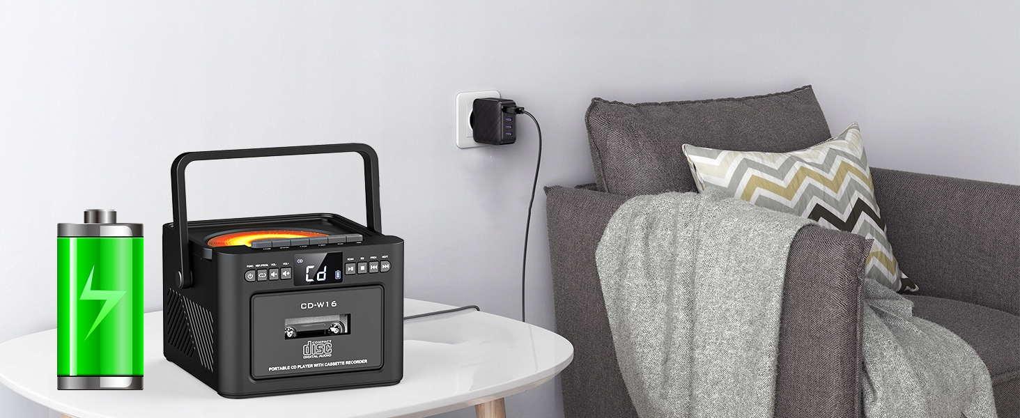 - Цей програвач компакт-дисків оснащено потужним Акумулятор 5000 мАг. Він заряджається за допомогою кабелю 5 В/2 А Type-C і забезпечує до 5 годин використання після 10 годин заряджання.