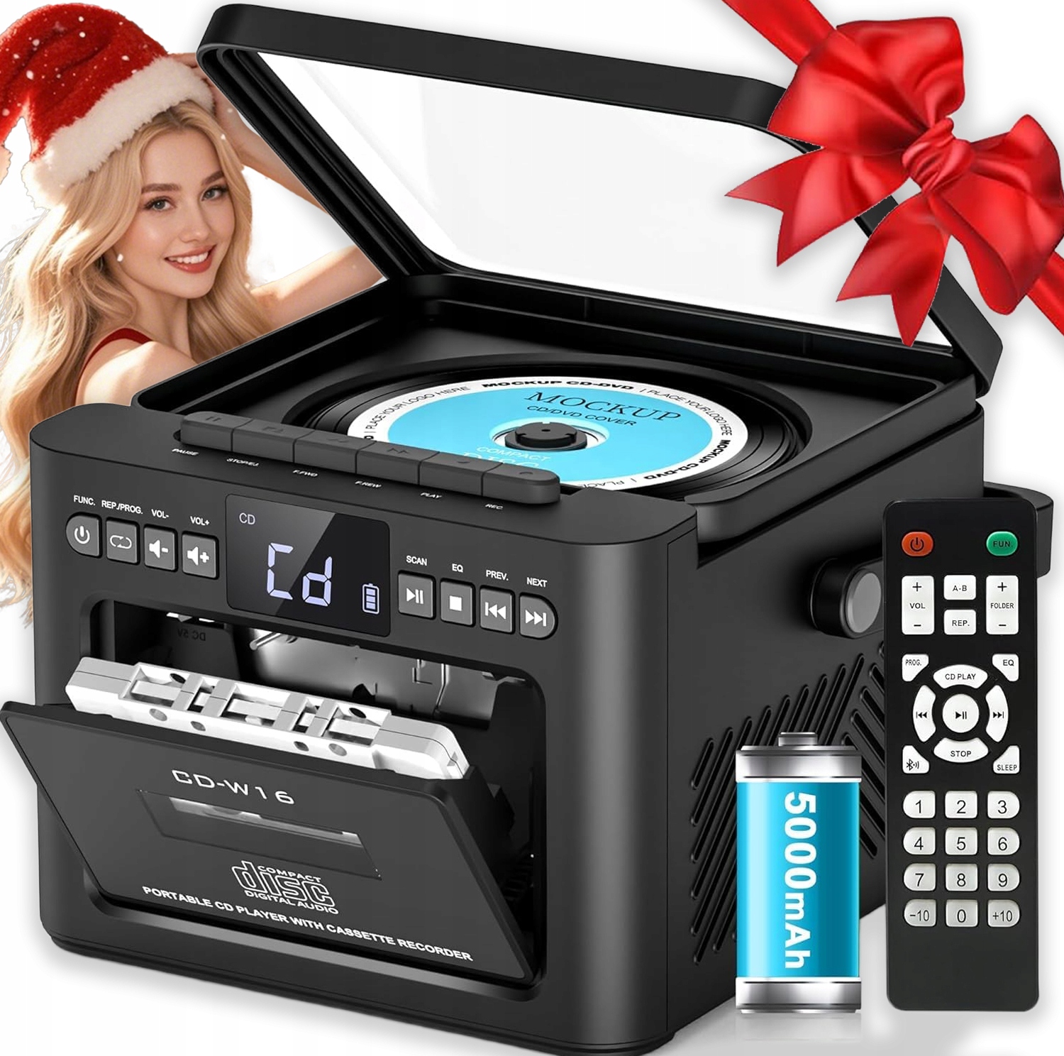 - Цей програвач компакт-дисків пропонує кілька варіантів відтворення, включаючи компакт-диски, радіо, касети, Bluetooth 5.1, USB, AUX і SD-карту.