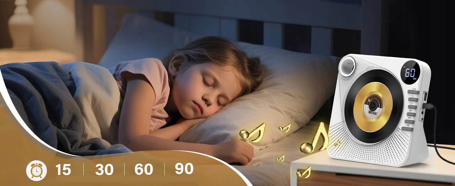 Дрімати під музику завдяки програмованому таймеру сну (15–90 хвилин), який автоматично вимикається. Програвач компакт-дисків потребує джерела живлення 5 В/2 А (не входить у комплект).