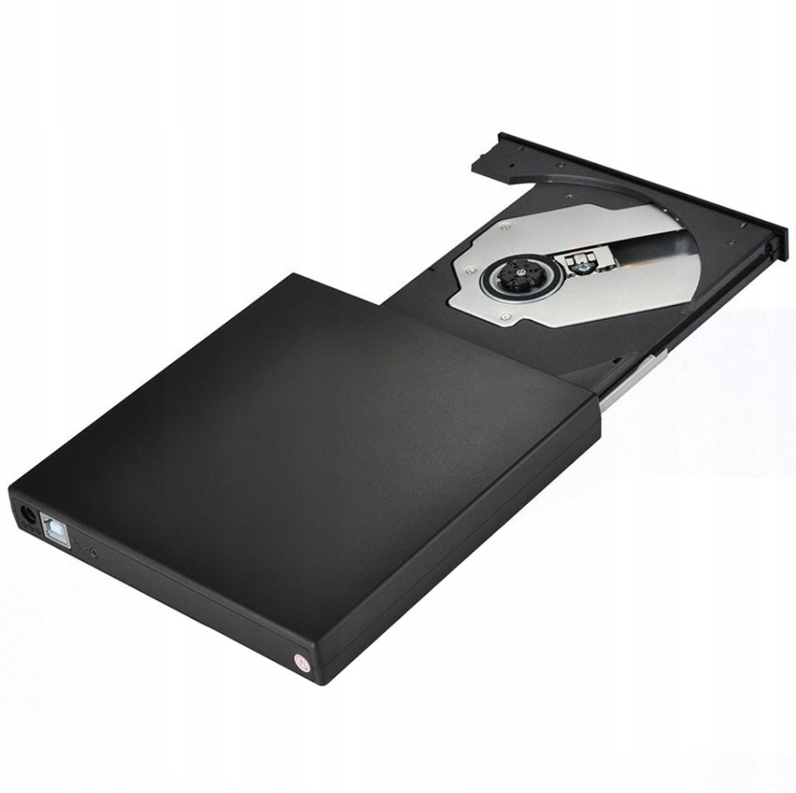 Портативний зовнішній оптичний привід CD/DVD. Він використовує USB-порти для зв'язку з комп'ютером і джерелом живлення.