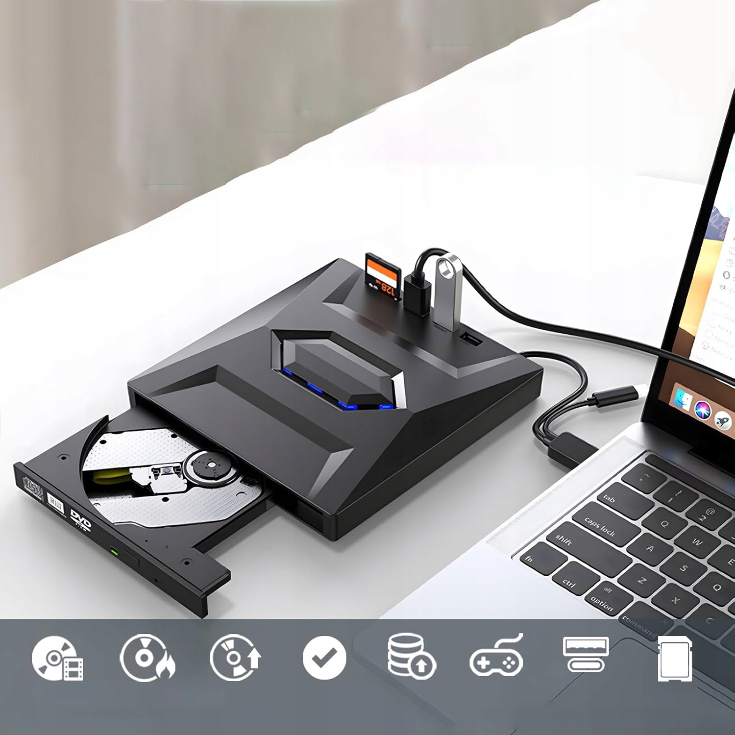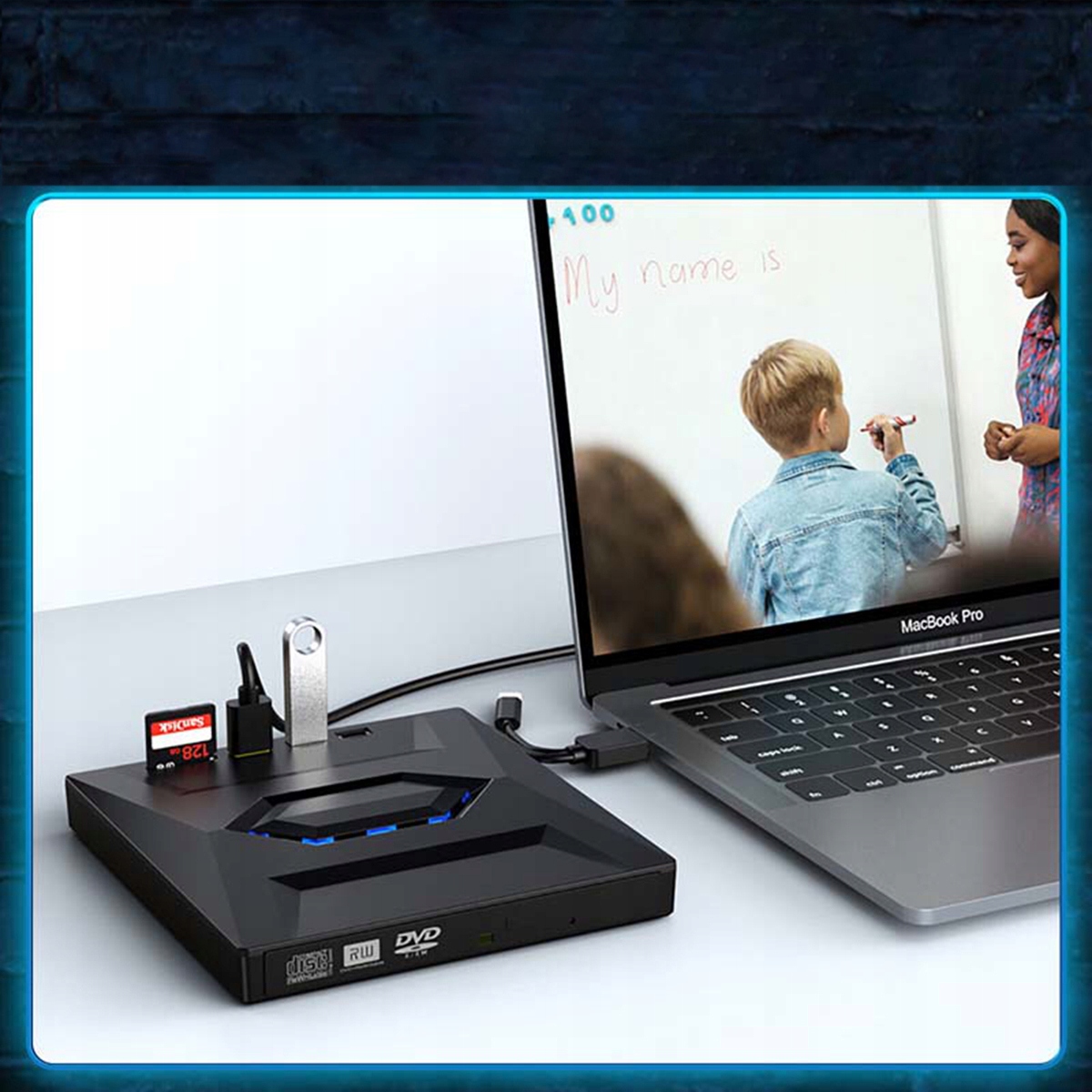 - Наш портативний DVD-програвач можна використовувати як пристрій для читання CD/DVD, пристрій для запису, 4-портовий концентратор USB 3.0, пристрій для зчитування карт SD і TF пристрій для читання.
