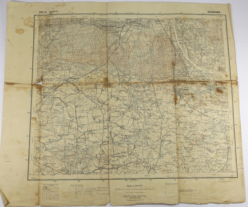 Оригінал Дуже цікава, рідкісна довоєнна польська військова карта WIG, Ciechocinek Toruń Podgórz Aleksandrów, Pas 37 Pole 27, масштаб 1:100 000, розмір 47 x 36 см. Гарний стан, потерта карта з розривами та незначними втратами паперу. Стан. Добре видно на фотографіях, доданих до опису аукціону. Якщо у вас виникли сумніви чи запитання щодо стану перерахованих предметів, зв’яжіться з нами. до закінчення аукціону.