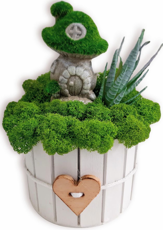 ЦІКАВА ДЕКОРАЦІЯ, У ЯКІЙ ВИКОРИСТАНИЙ МОХ ХРОБОТЕК У ПОЄДНАННІ З КЕРАМІЧНОЮ ХАТИНКОЮ З ДАХОМ ЗІ ШТУЧНОГО МОХУ ТА ШТУЧНОГО СУККУЛЕНТУ