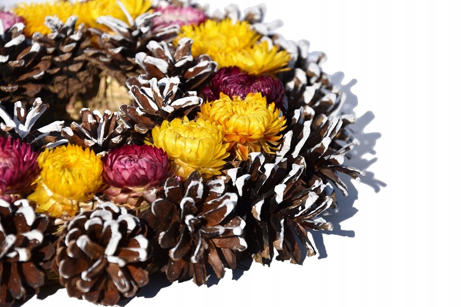 Декорація із соснових шишок і квітів на солом’яній основі (вінок)
