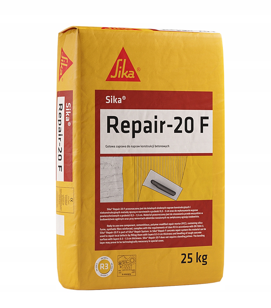 Sika® Repair-20 F — це готовий однокомпонентний полімерцементний розчин (PCC), що містить мікрокремнезем, армований синтетичними волокнами. Sika® Repair-20 F у системі Sika® Repair F — це ремонтно-вирівнюючий розчин для заповнення дефектів бетону з або без зв’язуючого шару Sika® Repair-10 F. Розчин можна наносити вручну або вологим розпиленням. Sika® Repair-20 F відповідає вимогам до ремонтного розчину класу R3 згідно з PN-EN 1504-3.
