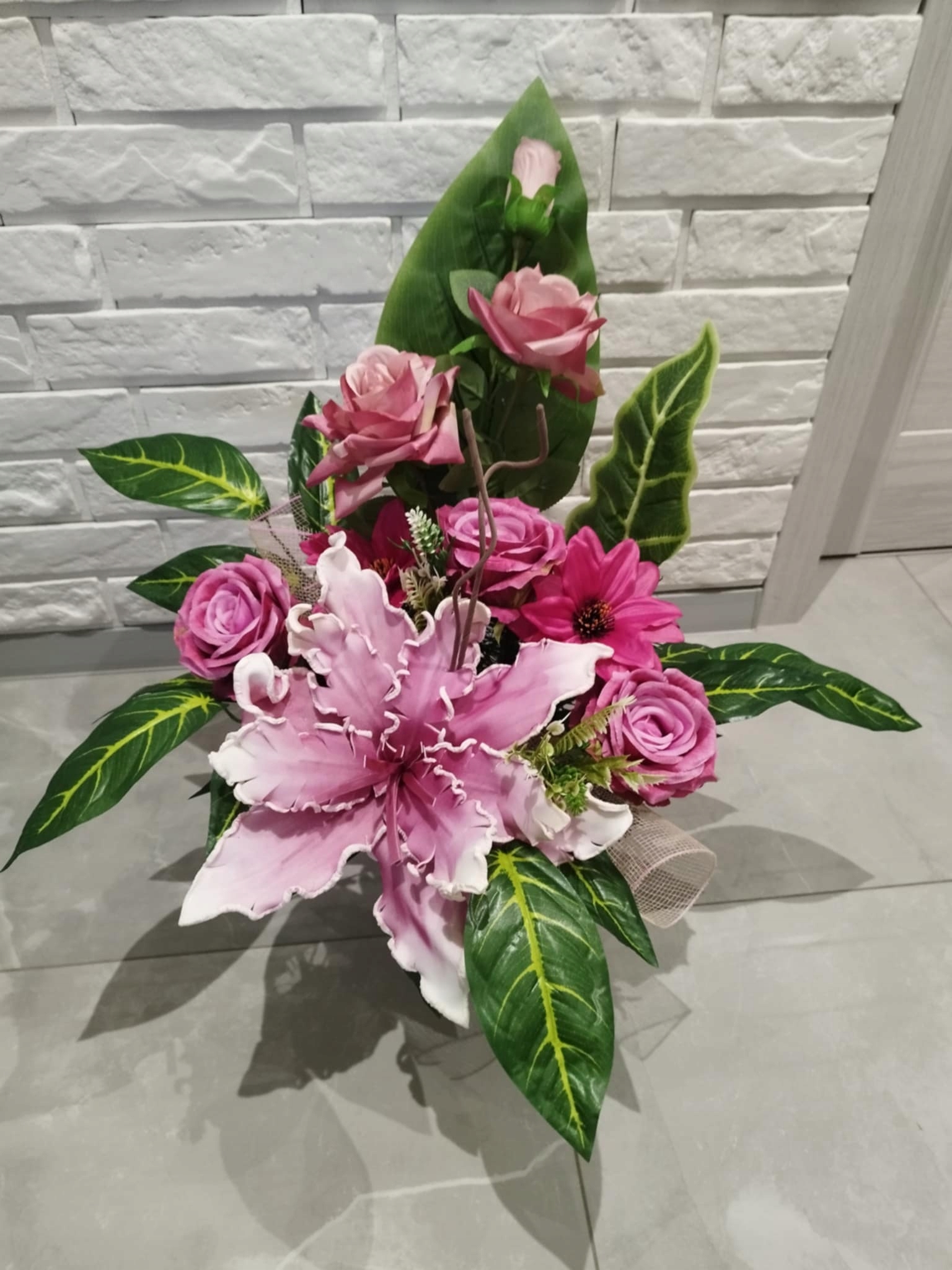 Набір складається з вражаючої композиції в горщику та ідеально підібраної вставки для вази - обидва елементи створюють цілісне, гармонійне ціле, яке красиво виглядає на будь-якому пам’ятнику.