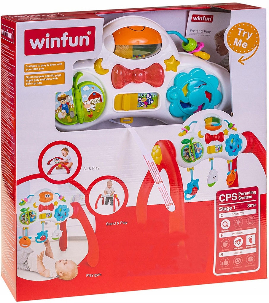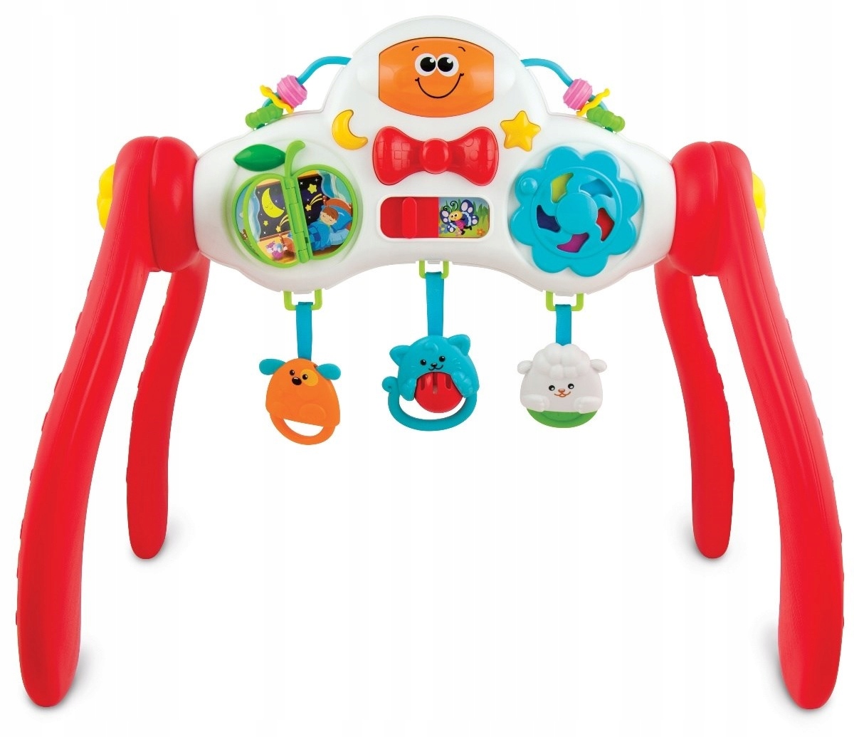 Розклавши іграшку, дитина, що лежить, може грати з Mini-Gym. Панель з мелодіями можна прикріпити до ліжка. Брязкальця з тваринами легко від'єднати від іграшки і взяти з собою на прогулянку.