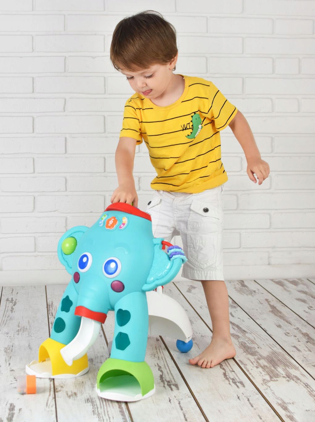Іграшка у формі слона, обтічні форми та насичені кольори спонукають до активної гри. Він підтримує розвиток великої та дрібної моторики та стимулює сенсорику малюка.