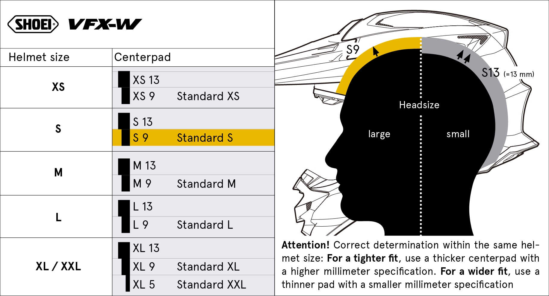 Центральні вставки різних розмірів можна використовувати для заміни оригінальної вставки або для окремого встановлення шолома на маківці. Підкладка даної моделі шолома може бути замінена в межах призначеного діапазону розмірів, наприклад, "XL5" - "XL9" - "XL13". «XL5» означає тоншу, «XL13» означає товщу підкладку, як показано в таблиці нижче.