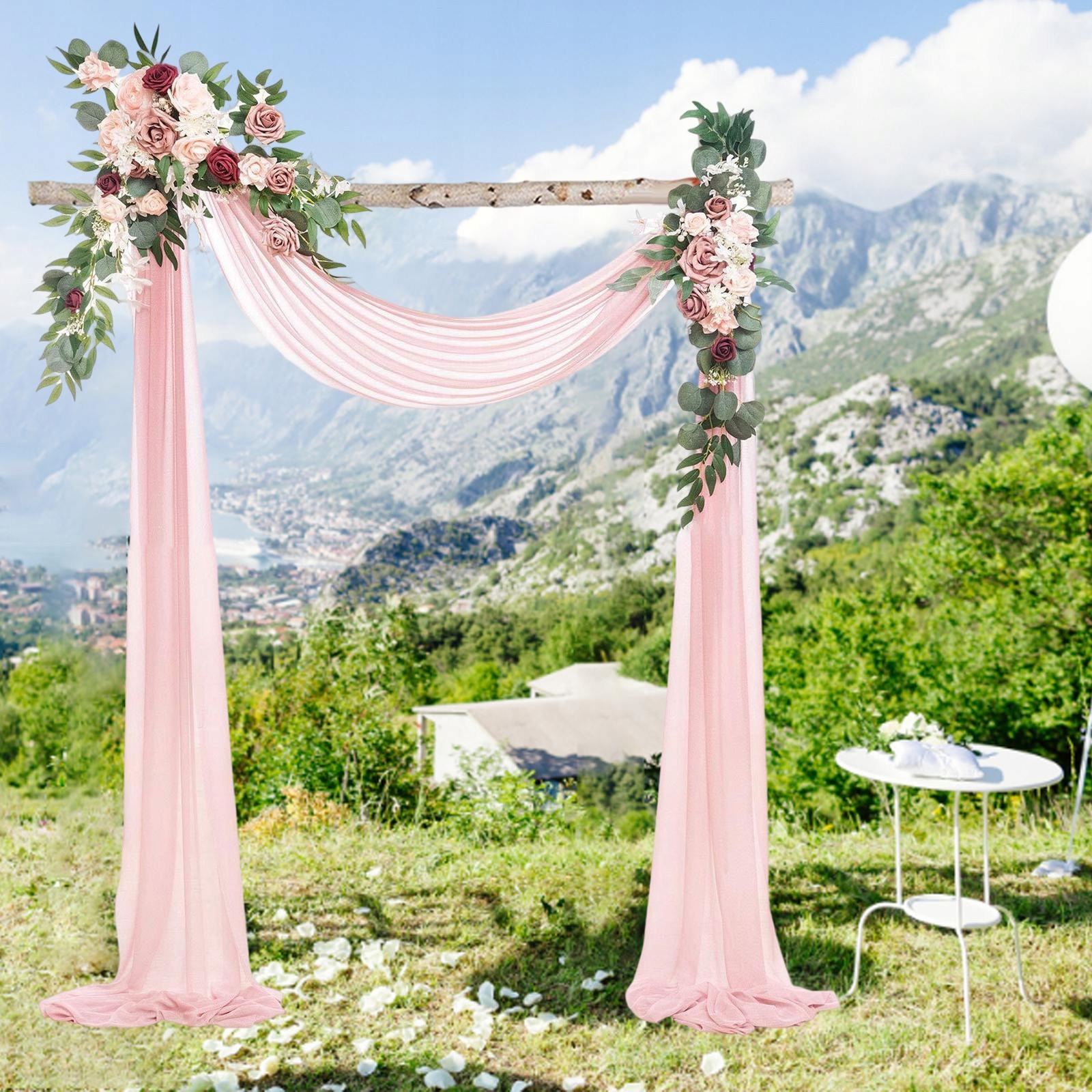 весільна драпірування: арочні весільні квіти, прикрашені арочними шторами, жвавими та реалістичними, ідеально підходять для весільних прикрас.