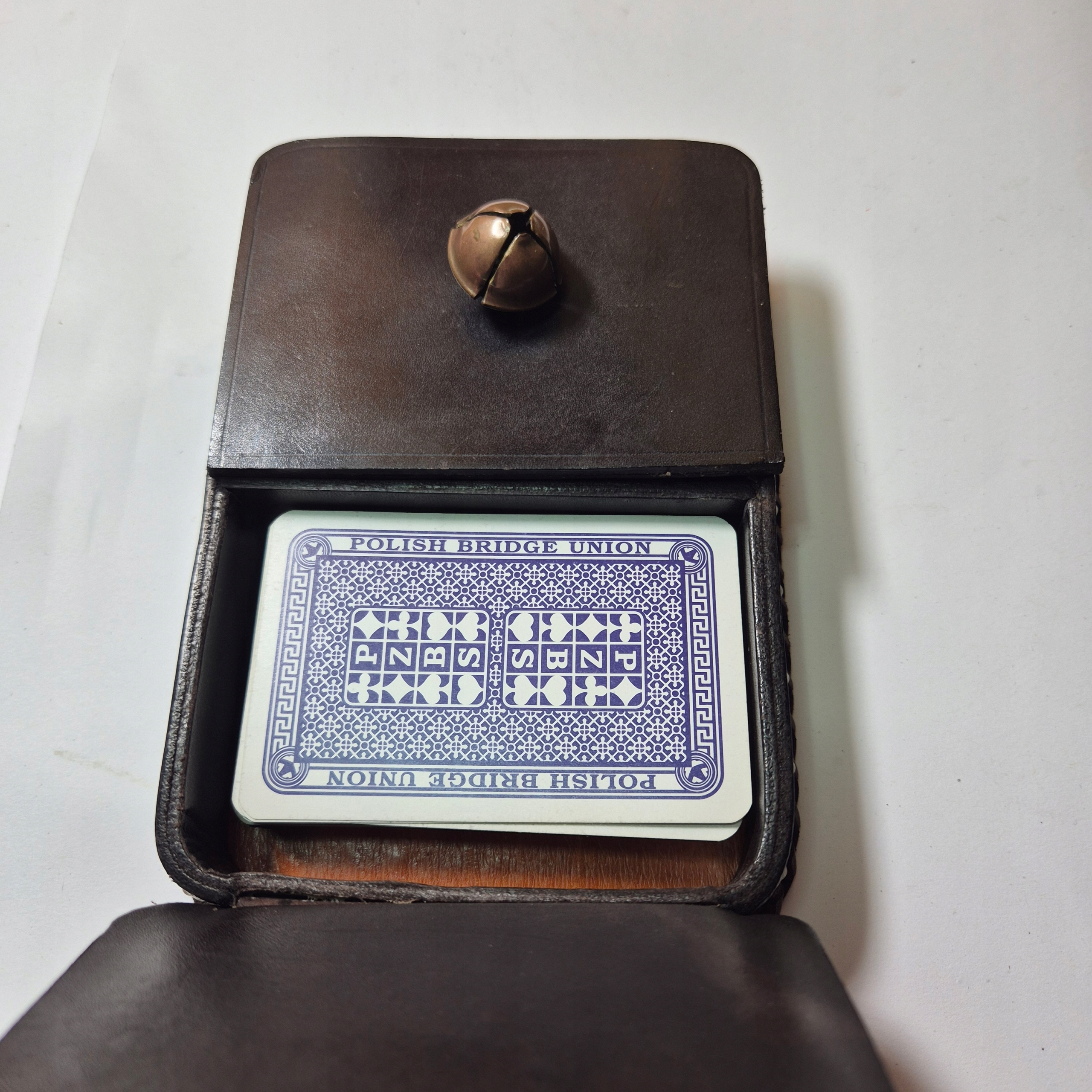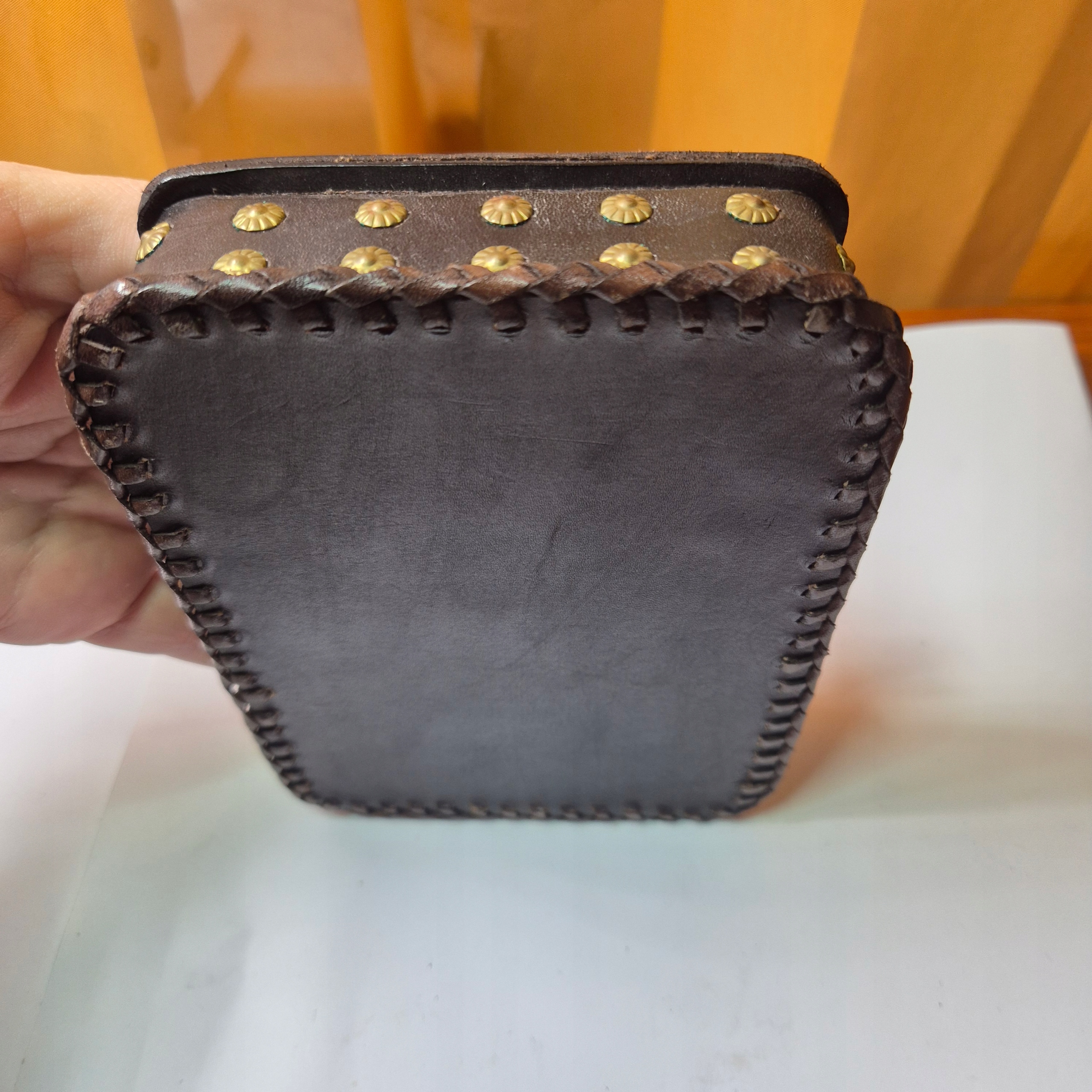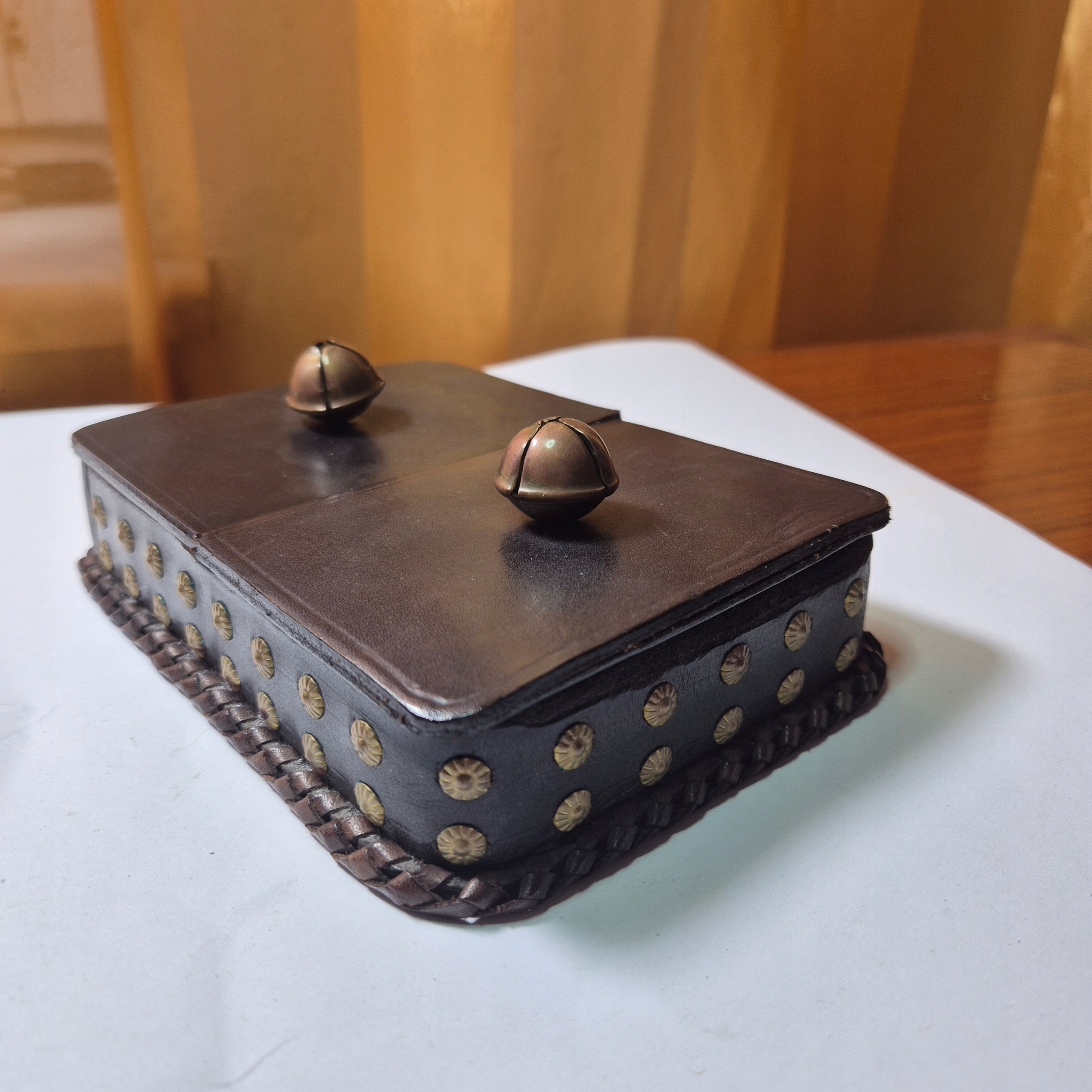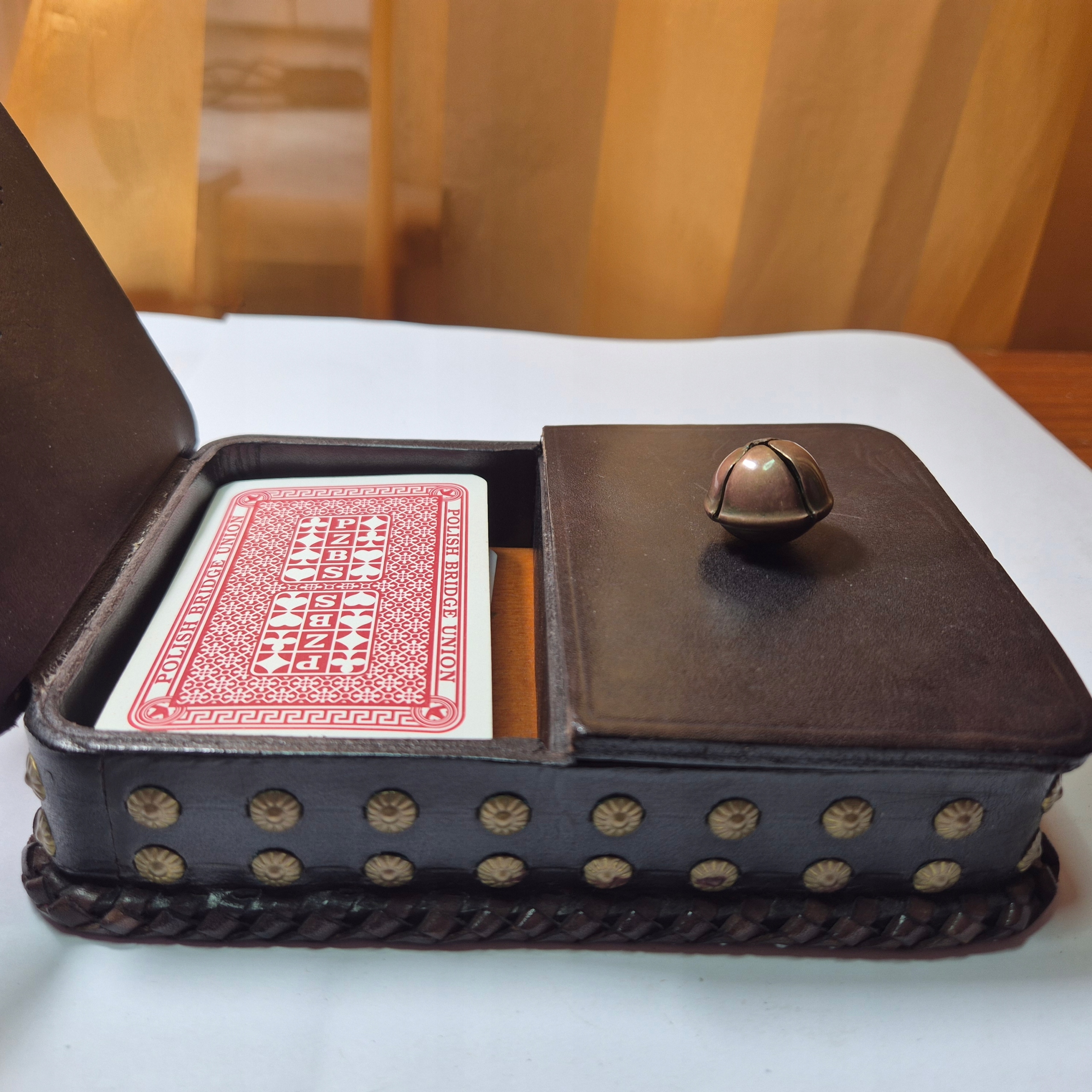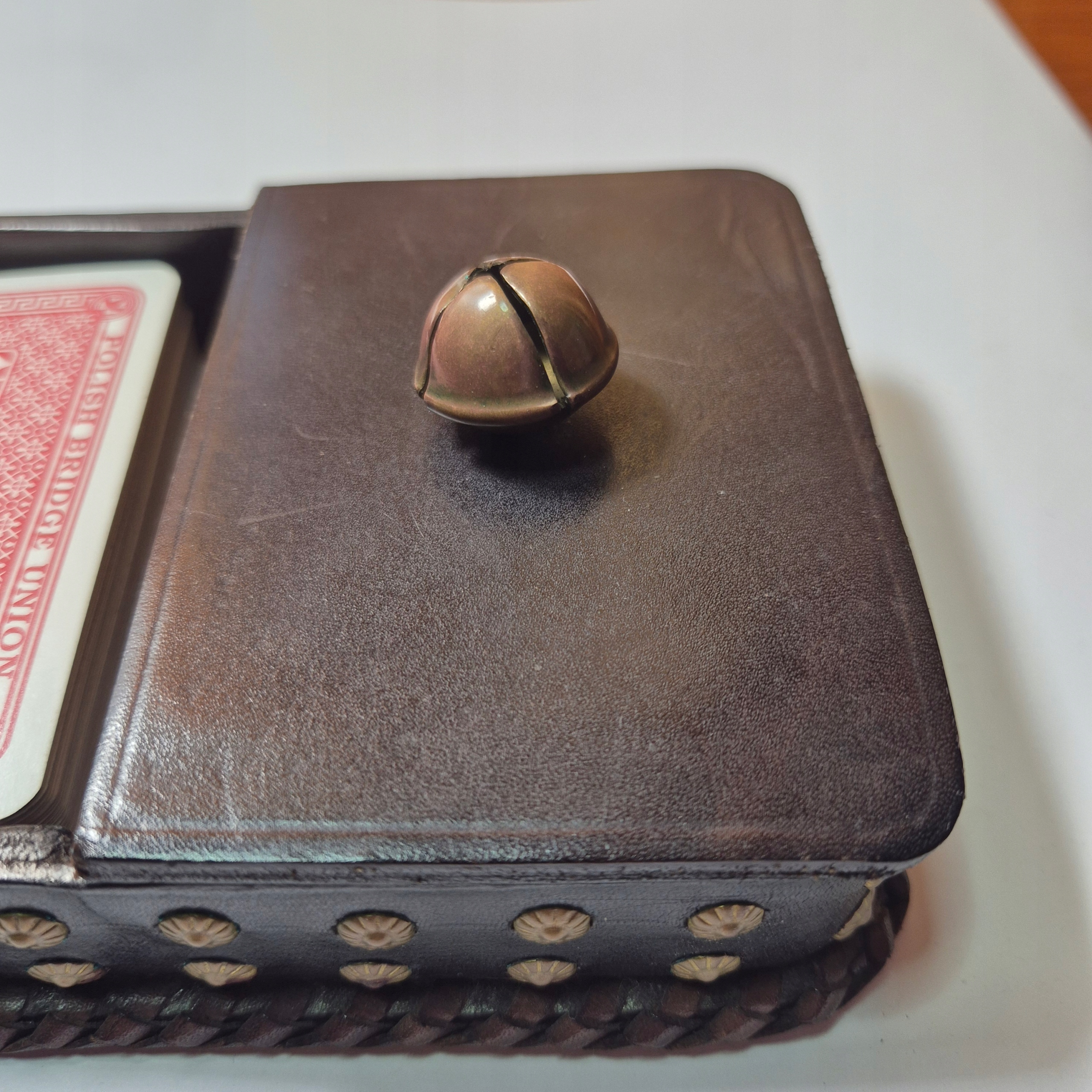 Beautiful old leather card box, finished with brass studs and highlander Janczars