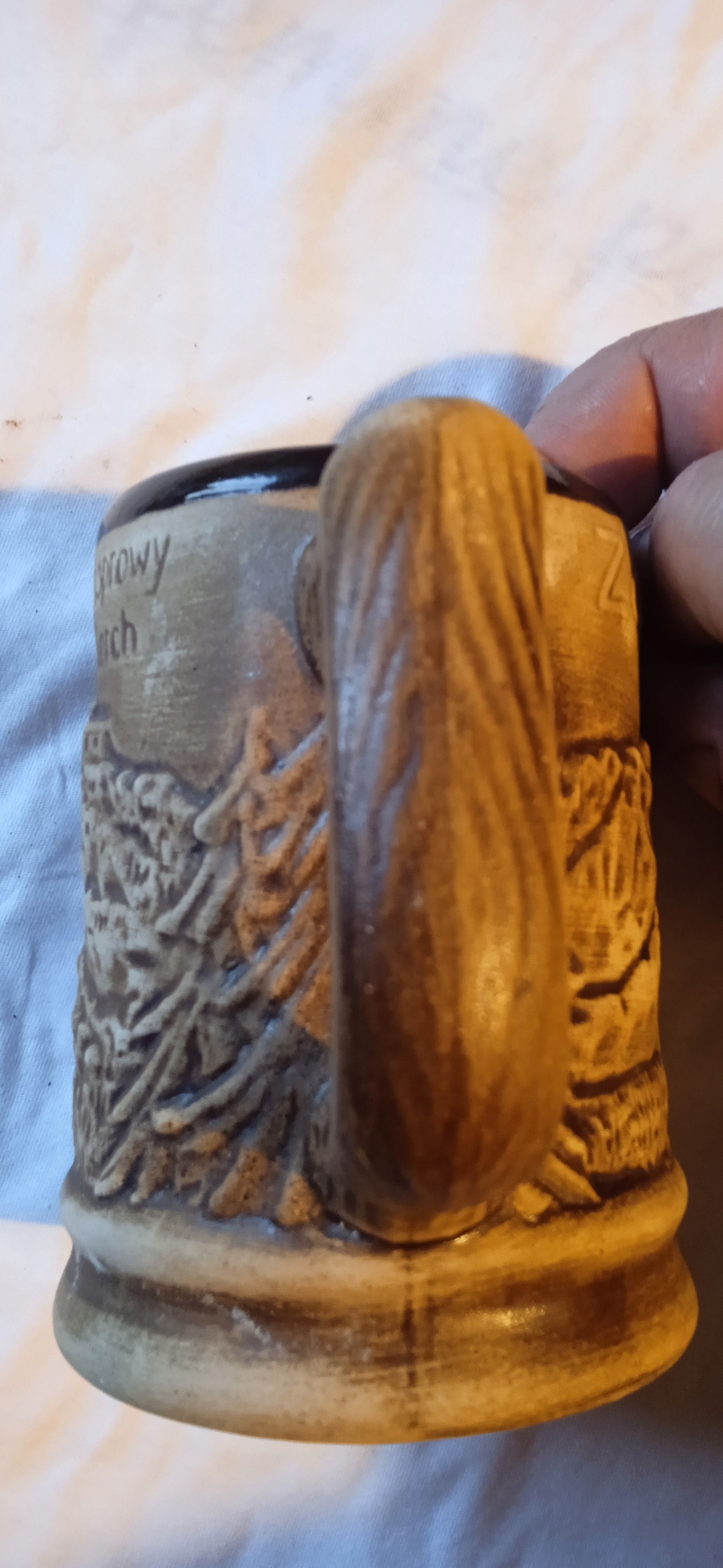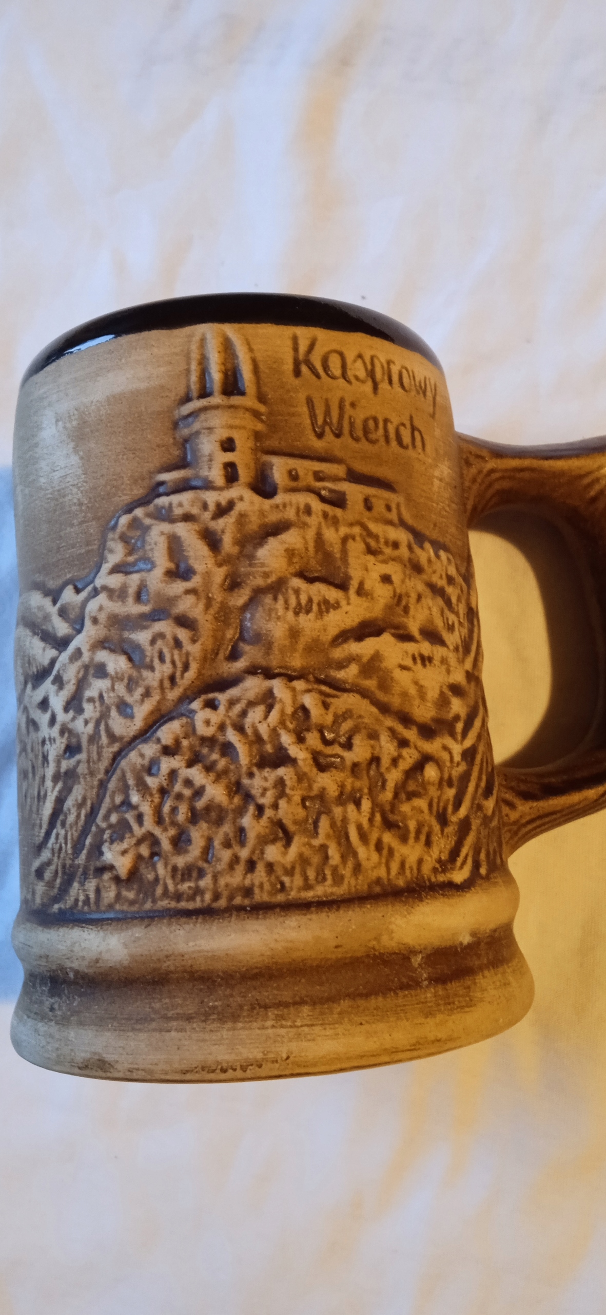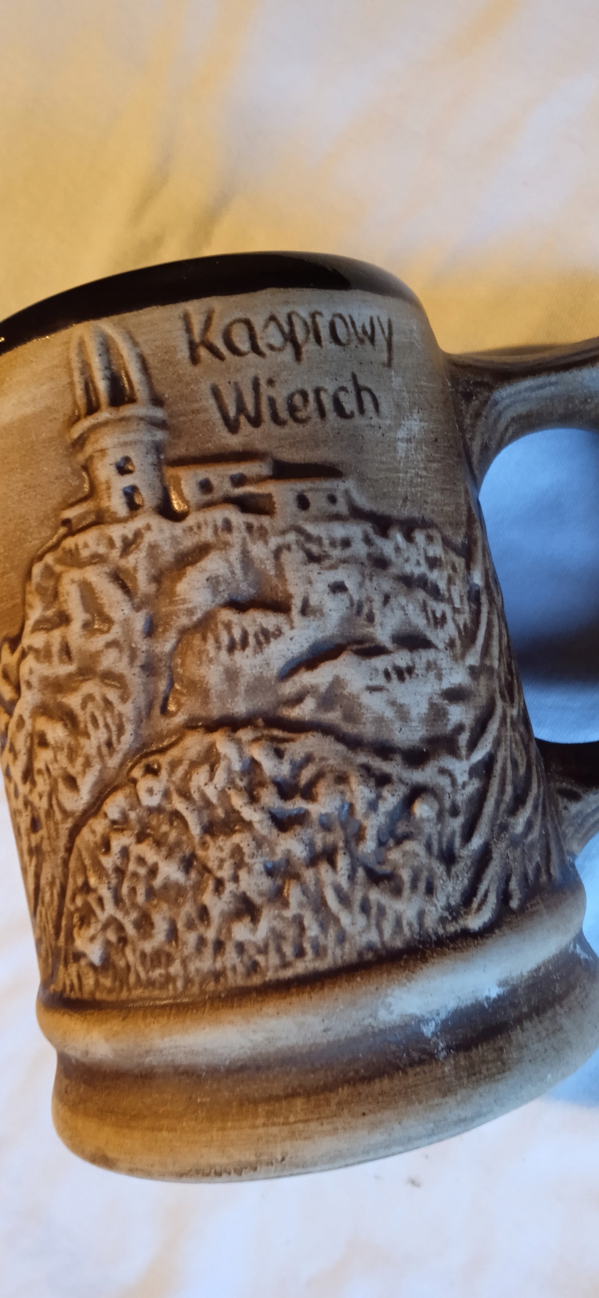 Пропоную на продаж цікаву керамічну чашку з рекламою Закопаного та Каспрового Верху. Кружка глазурована тільки всередині та по бортику, колір глазурі темно-коричневий. Знизу підпис: Manufaktura polska Ceramski. Стан хороший, тільки по краю є три дрібних дефекти емалі, приблизно 2 мм в діаметрі. , видно на фото 5 і 6 у вигляді маленьких білих плям. Висота 12 см. Діаметр (зверху) 7,9 / 9,1 см.