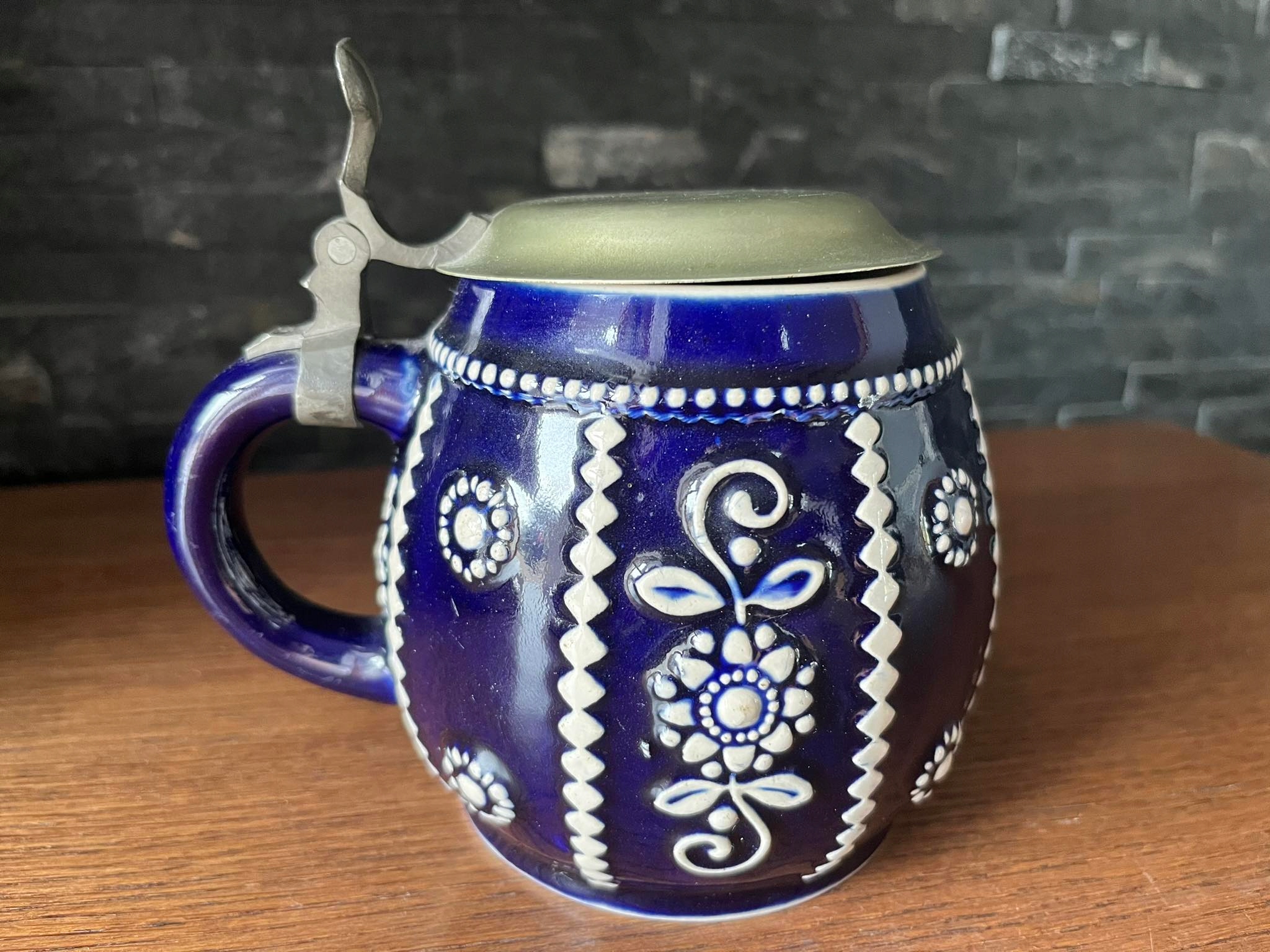 Ceramiczny sygnowany kufel z pokrywką mosiądz cyna kobalt