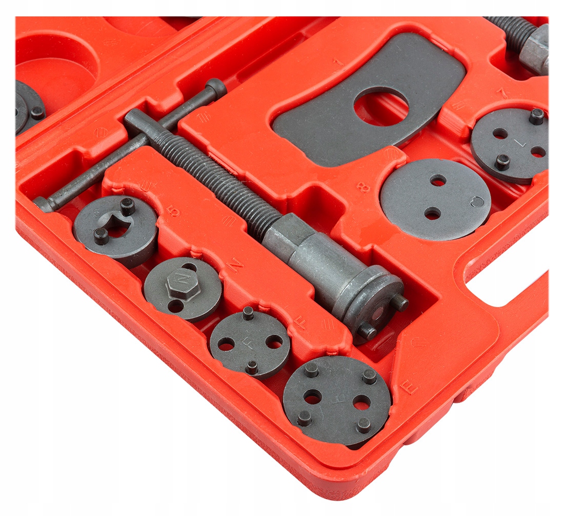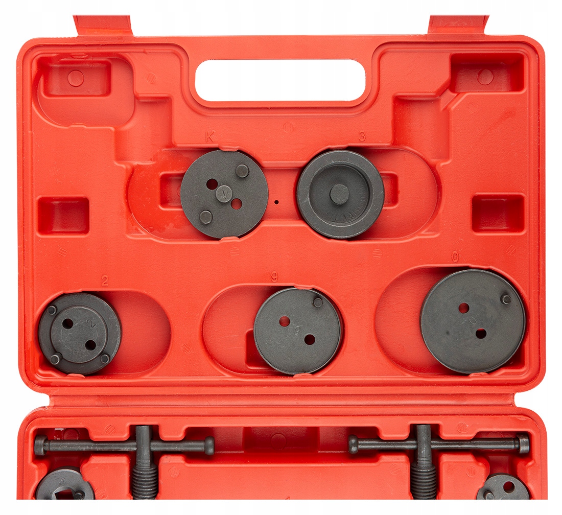 Включіть два преси (праворуч), а також преса до розміру гальмівних поршнів, які використовуються в більшості пасажирських автомобілів. Ручка, оснащена магнітним наконечником, що утримує кожен адаптер.