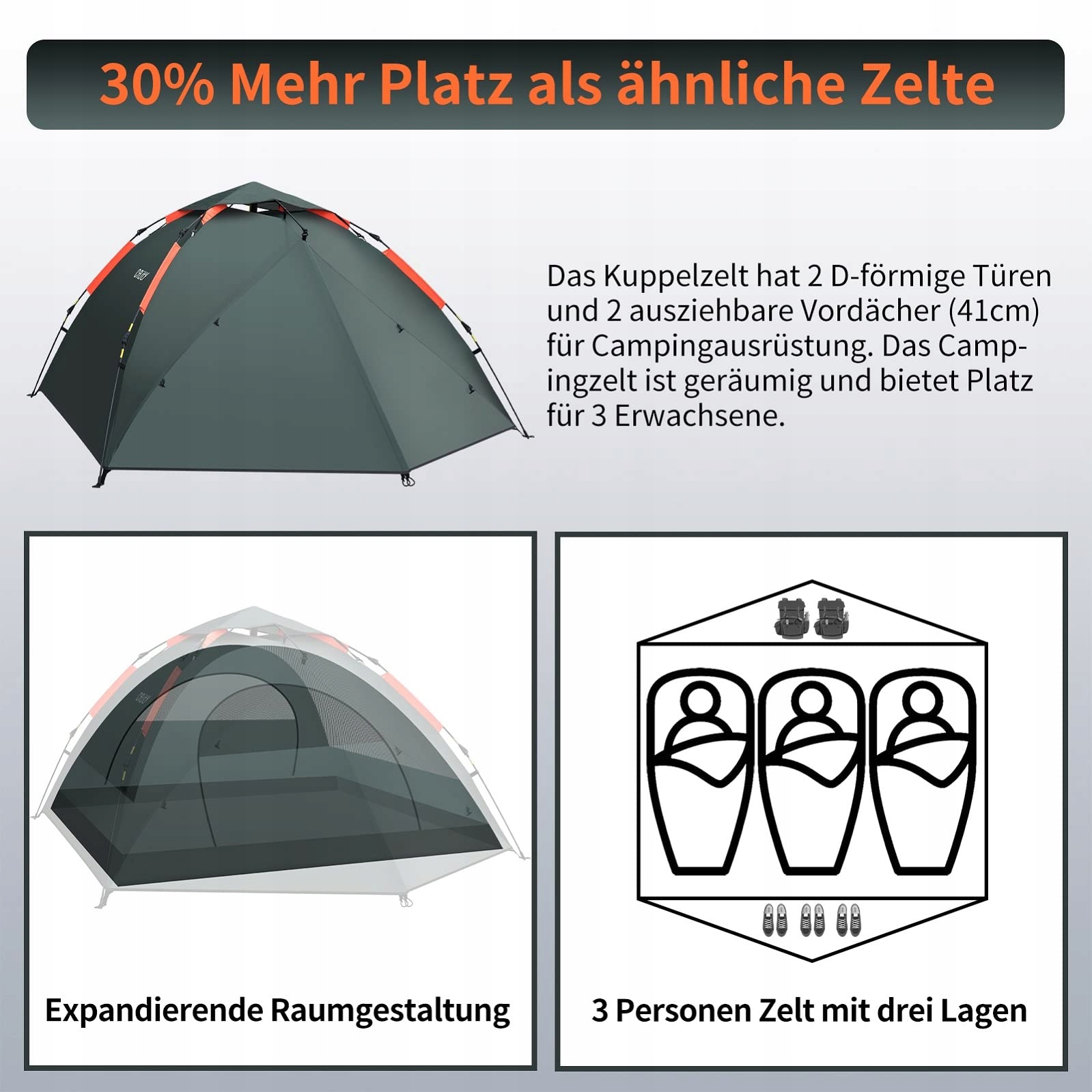 намет для кемпінгу Cflity, 3 людини, негайний спливаючий намет, водонепроникний, тришаровий, автоматичний купольний намет, великі намети протягом 4 сезонів з дахом, 2 розширювані ганки