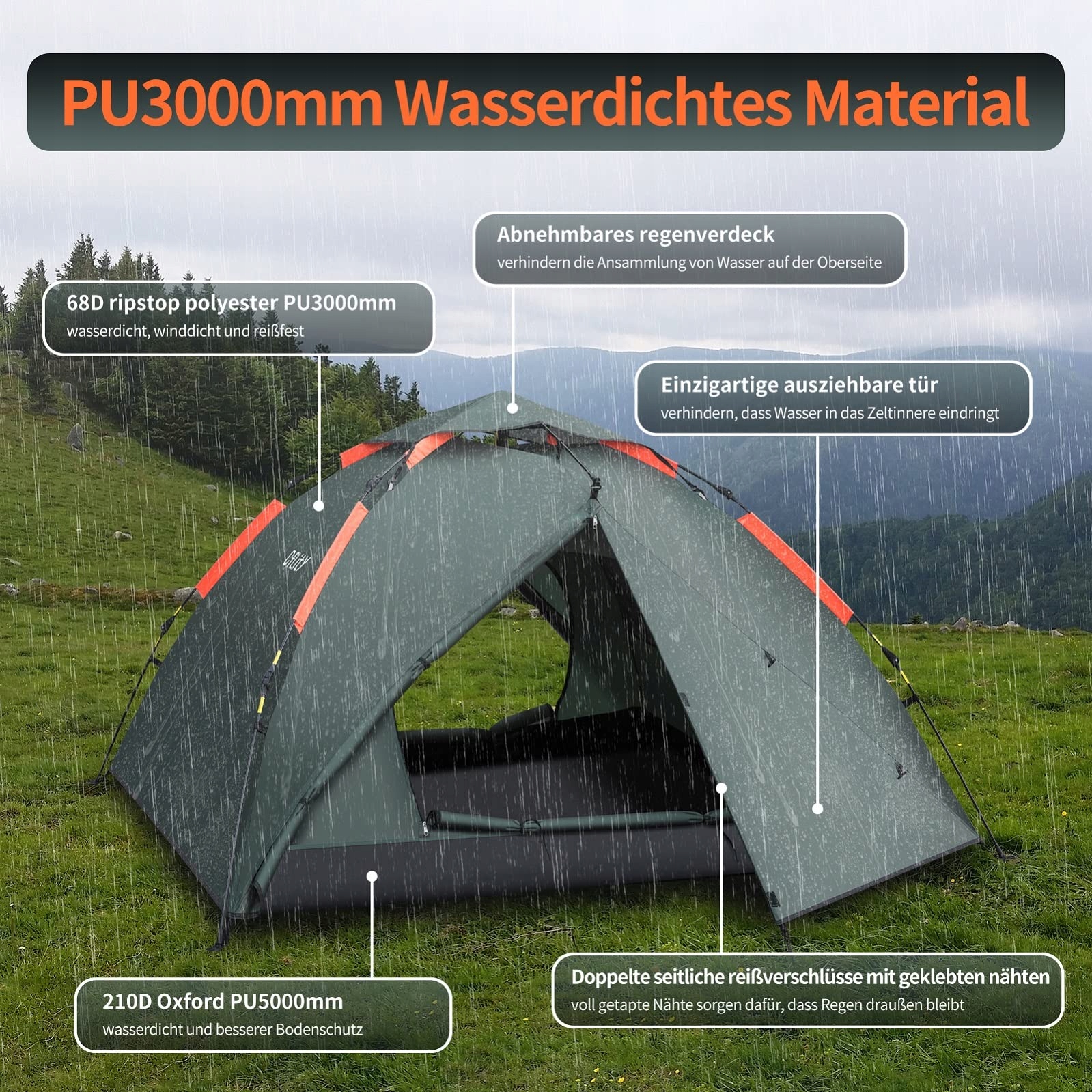 - Водонепроникний тришаровий намет: 68D 210T поліестер, покритий поліуретаном PU 3000 мм, спеціальним водонепроникним матеріалом, тришаровою структурою та відмінним водонепроникним та клейким процесом на кожному шва (блискавки, 4 кути, гачки, підлога) забезпечують, щоб наш автоматичний намет витримав літні шторми. (Будь ласка, зверніть увагу на результати відеозаписів). Унікальні телескопічні двері краще забезпечують ідеальну ізоляцію від сильного дощу.