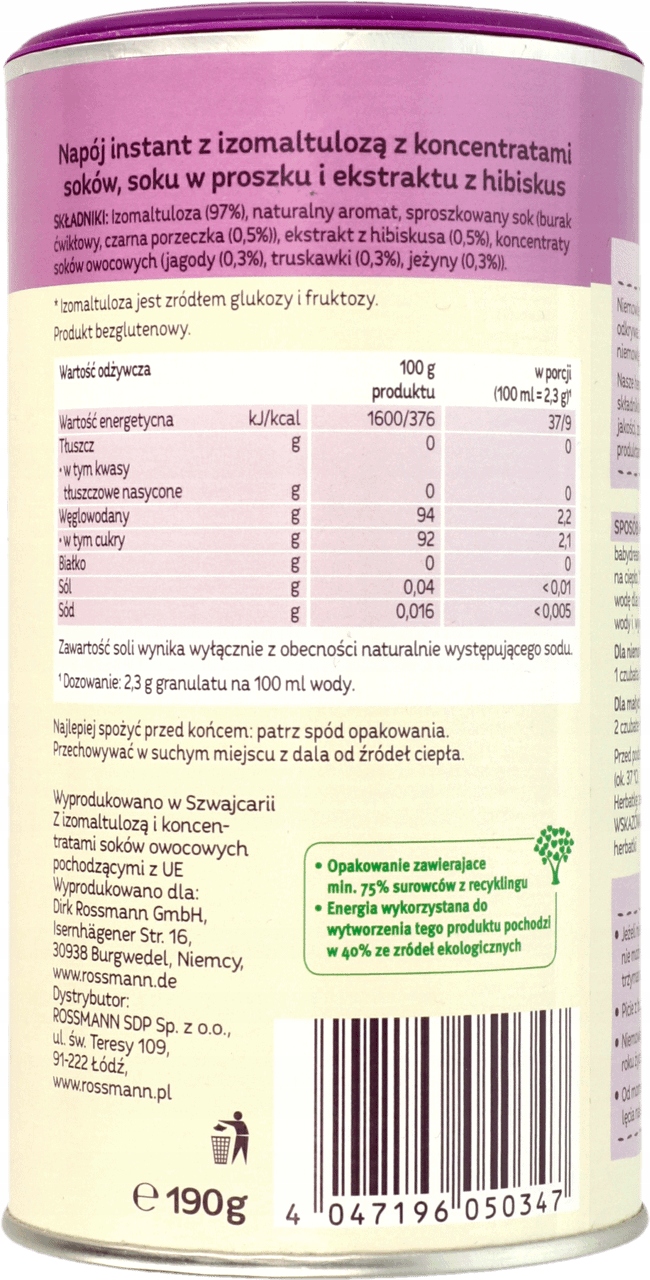 Швидкорозчинний напій з ізомальтулозою з концентратом соку, порошкоподібним соком і екстрактом гібіскуса.