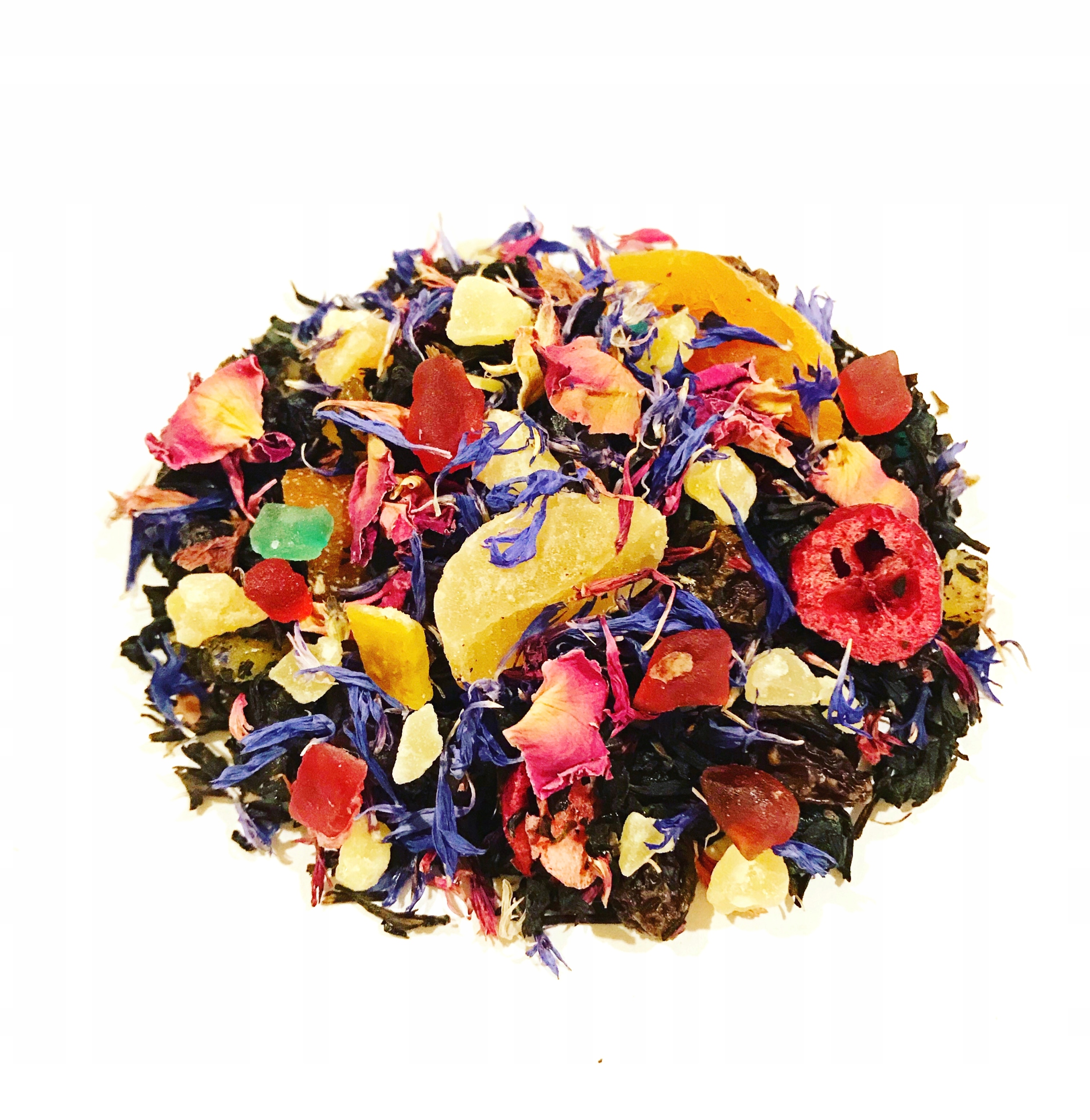 СКЛАД: чорний чай ЮННАНЬ, папайя, манго, абрикос, ананас, журавлина ліо, черешня, вишня та апельсинові цукати, виноград , пелюстки квітів чорнобривців, рожеві та блакитні волошки, пелюстки троянд, аромат.