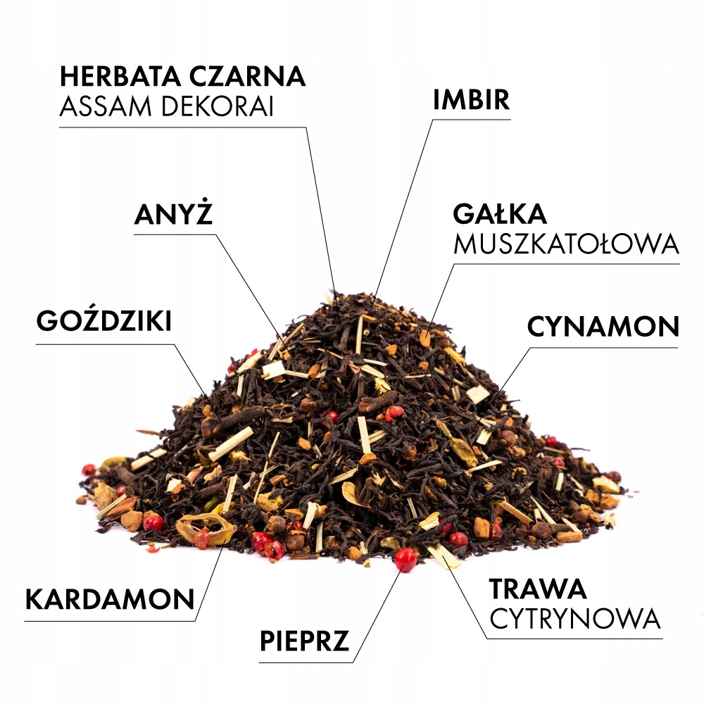 - Тип чаю: b > Високоякісний чорний листовий чай Assam Dekorai з імбиром, гвоздикою, лемонграсом, корицею, кардамоном, перцем, анісом і мускатним горіхом