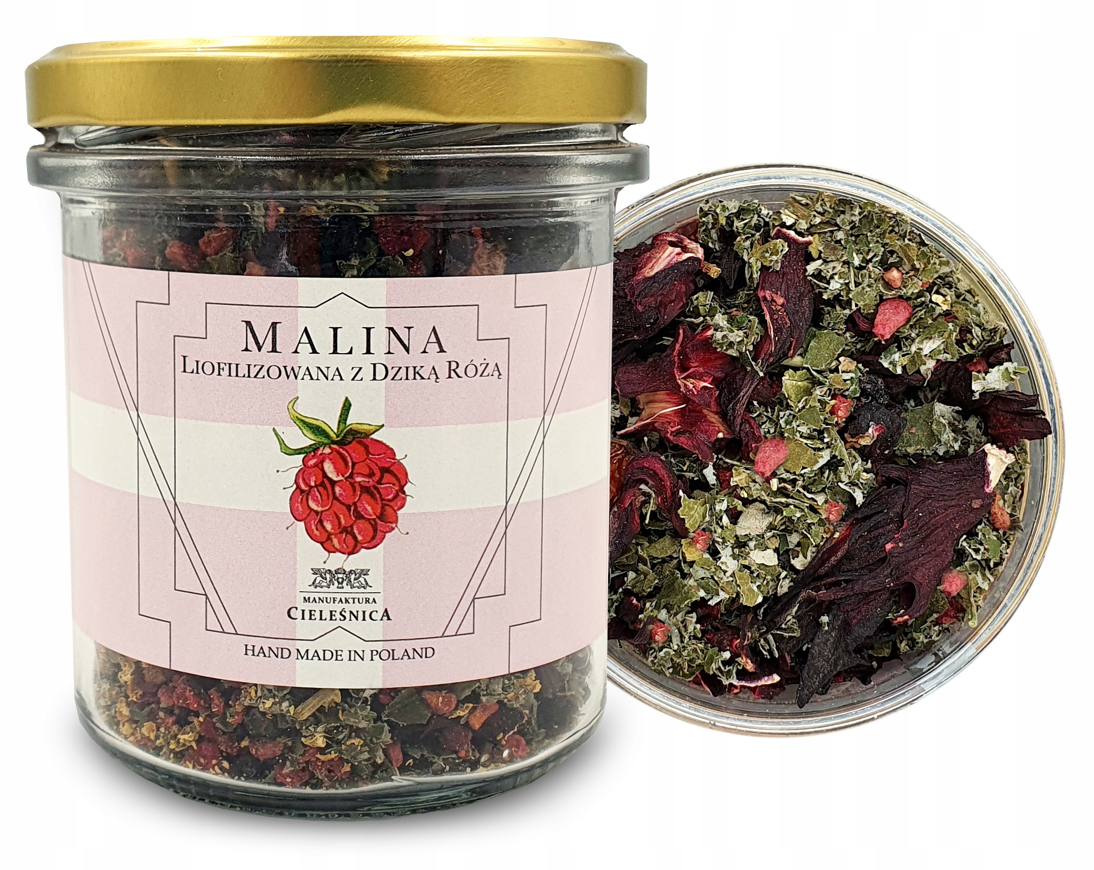 Інгредієнти: 22% ліофілізованих плодів малини, 22% плодів шипшини, 11% листя малини, гібіскус , бузина , чорноплідна горобина, чорна смородина