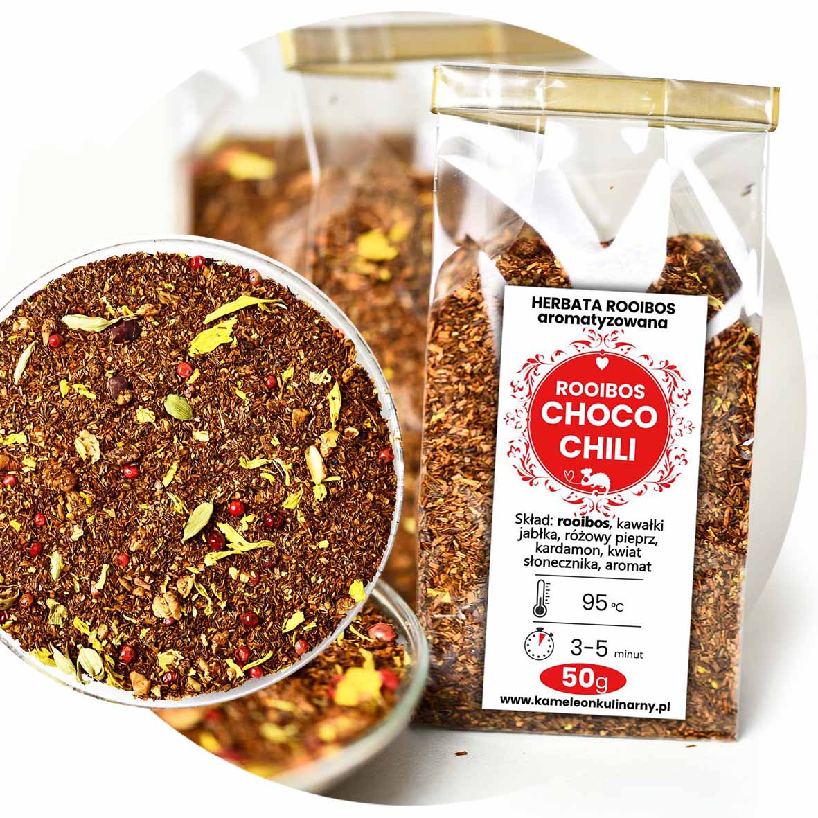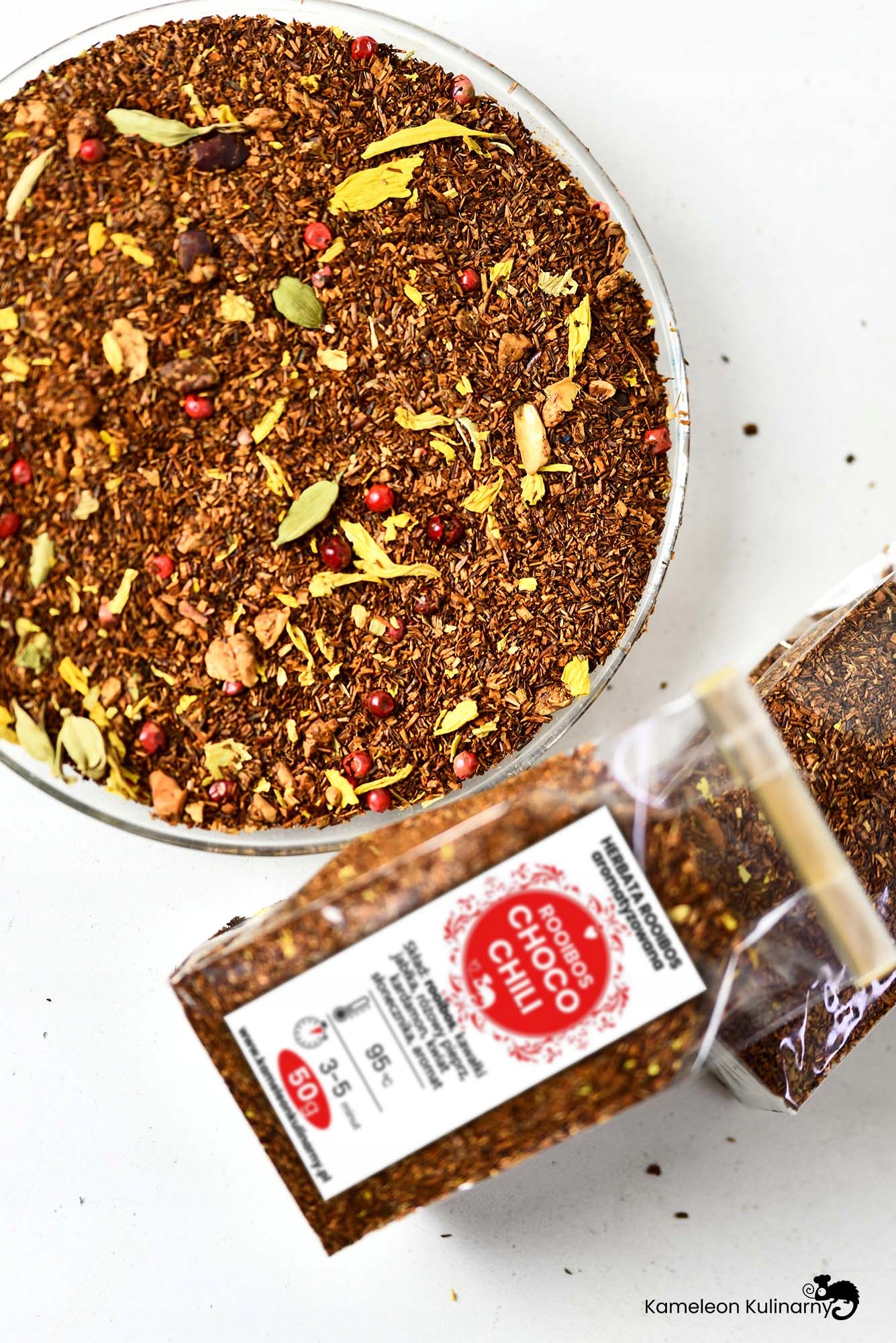 Rooibos CHOCO CHILI - унікальні аромати з додаванням перцю. і кардамону в поєднанні з яблучною нотою - унікальна, характерна композиція для любителів виразних смаків.