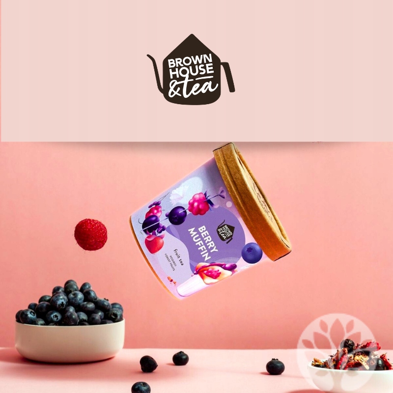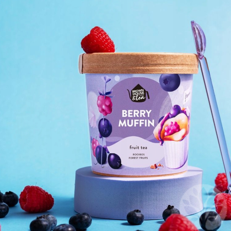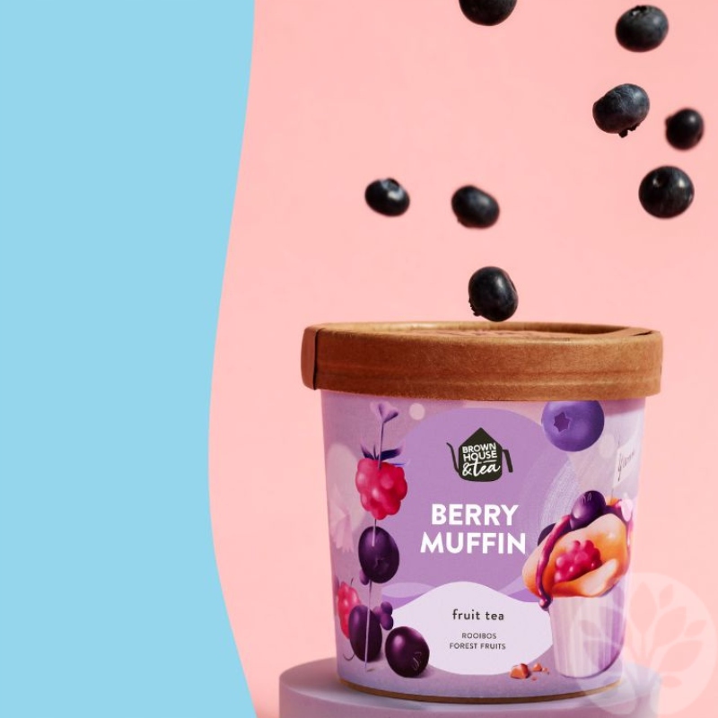 Беррі Мюффін від коричневого будинку та чаю до до чаю Ройбоса , що пахне свіжою гнучкою та смаком, як фруктовий ліс. без кофеїну , з натяком на малину, чорницю та полуницю - це вливання, яку ви можете пити в будь -який час доби навіть ввечері.