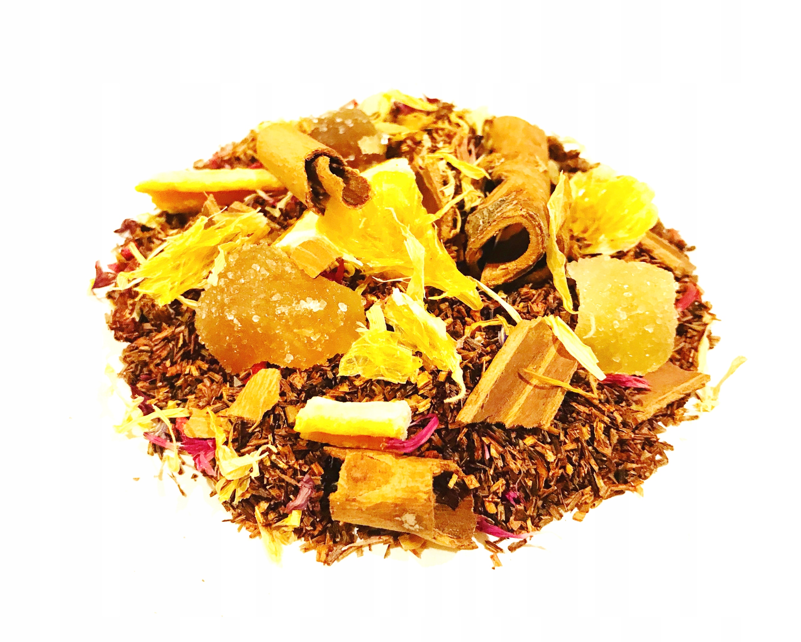 Склад: ройбуш, кора кориці, цукати імбиру, цукати апельсина, календули, пелюстки троянди та гібіскуса.