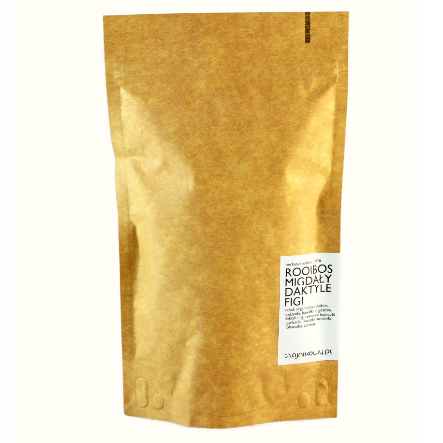 Листя ройбуш із шматочками мигдалю, фініків та інжиру. Легкий, прозорий настій, бурштинового кольору та з ніжним, гладким смак. Помітні нотки мигдалю та солодкість фініків та інжиру.