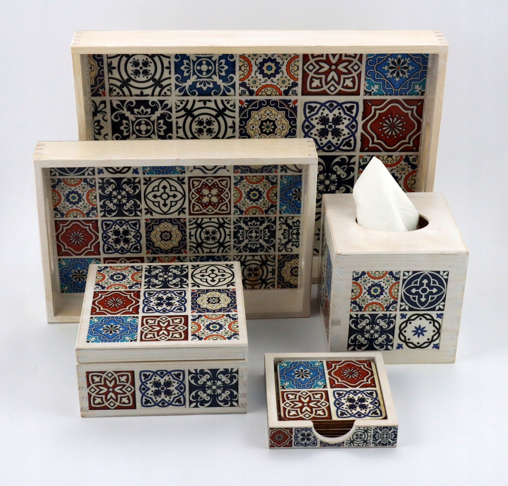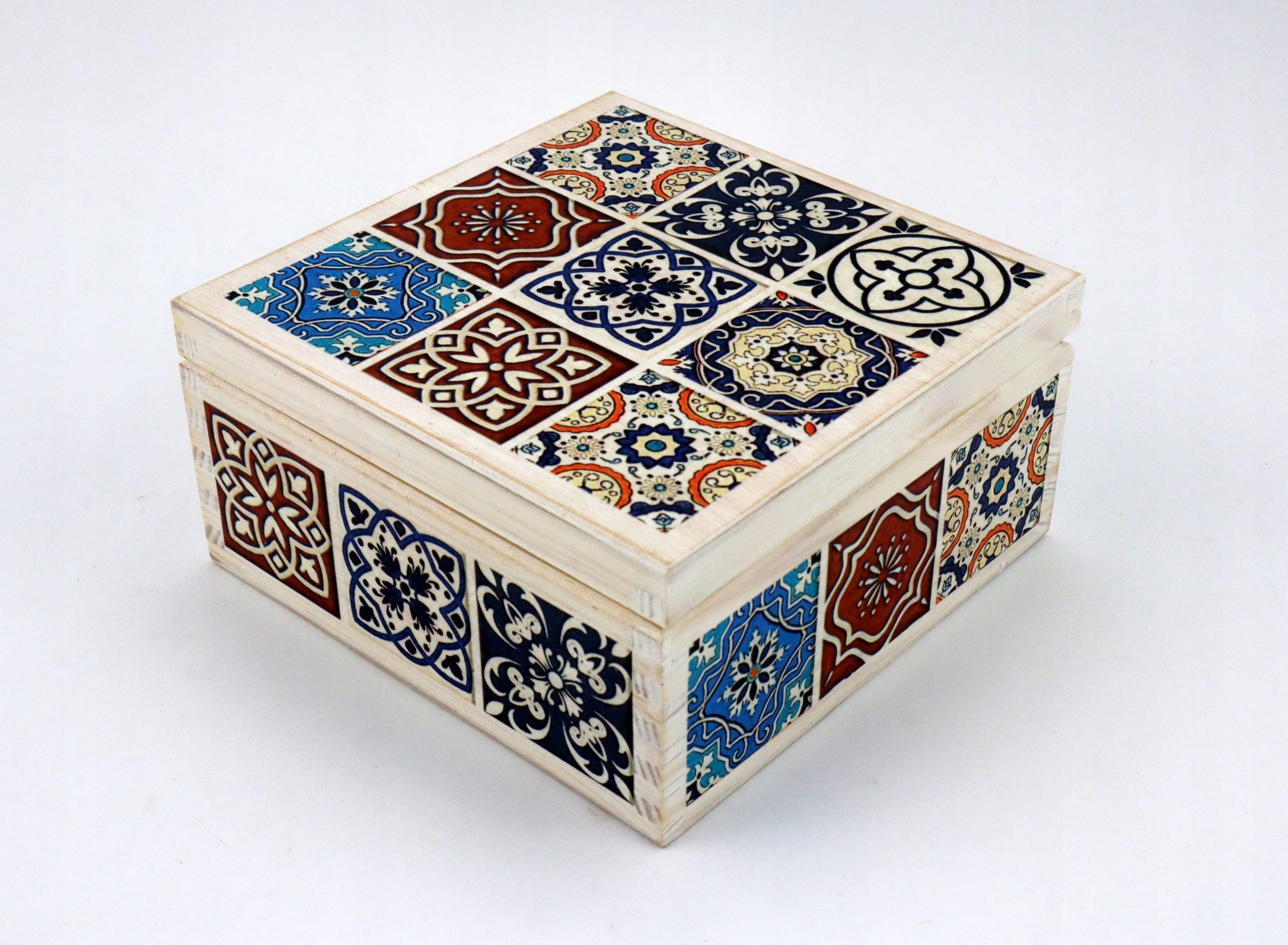 Дерев'яна коробка з чотирма відділеннями, прикрашена мотивом азулежос. Розписана вручну та декорована методом декупаж. Захищена прозорим лаком.