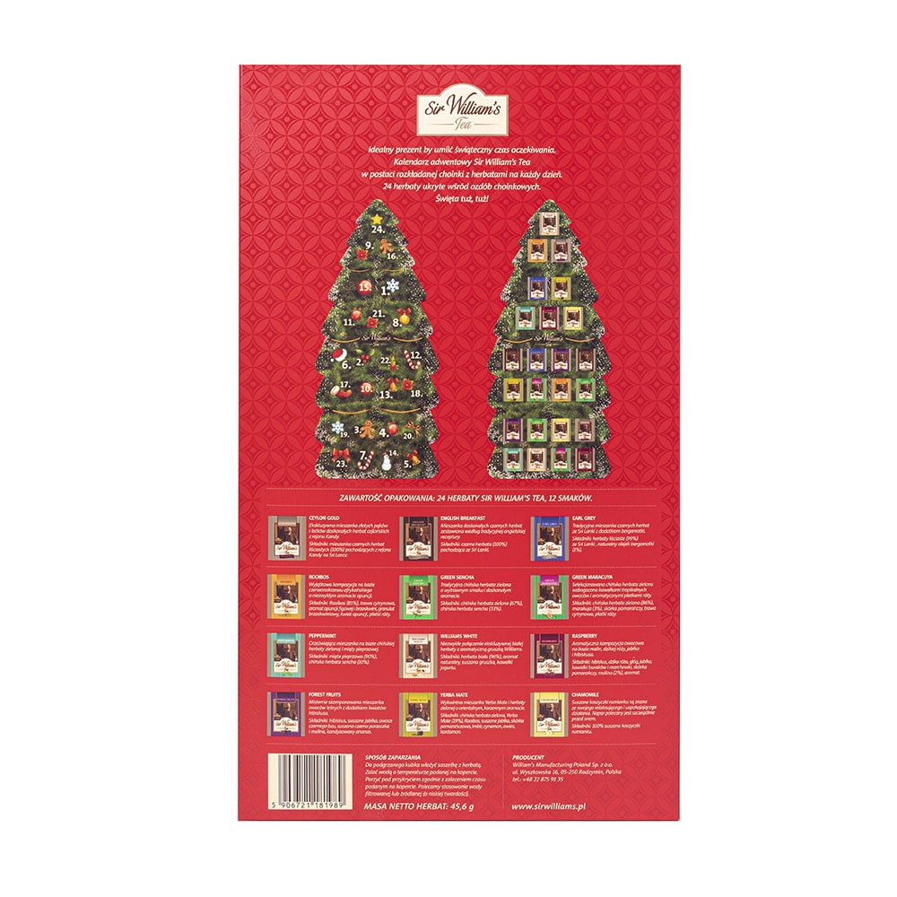 Вміст упаковки: декоративна картонна ялинка, 24 чаю Sir William's - 12 смаків.