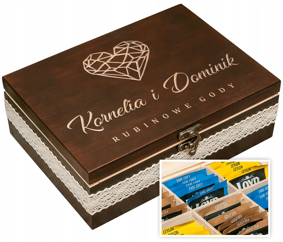 Коробка для чаю з гравіюванням імені на річницю весілля + набір з 30 ароматних чаїв - гарний і практичний подарунок, готовий до вручення!