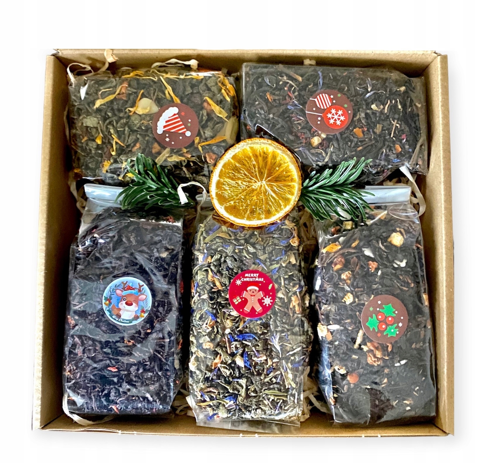 - Чай чорний мультикомпонентний 65 г "Біле Різдво". Інгредієнти: Чорна база Юньнань, цукрові прикраси, апельсинова цедра, апельсинова цукерка, родзинки, кориця, яблуко, гвоздика, аромат.