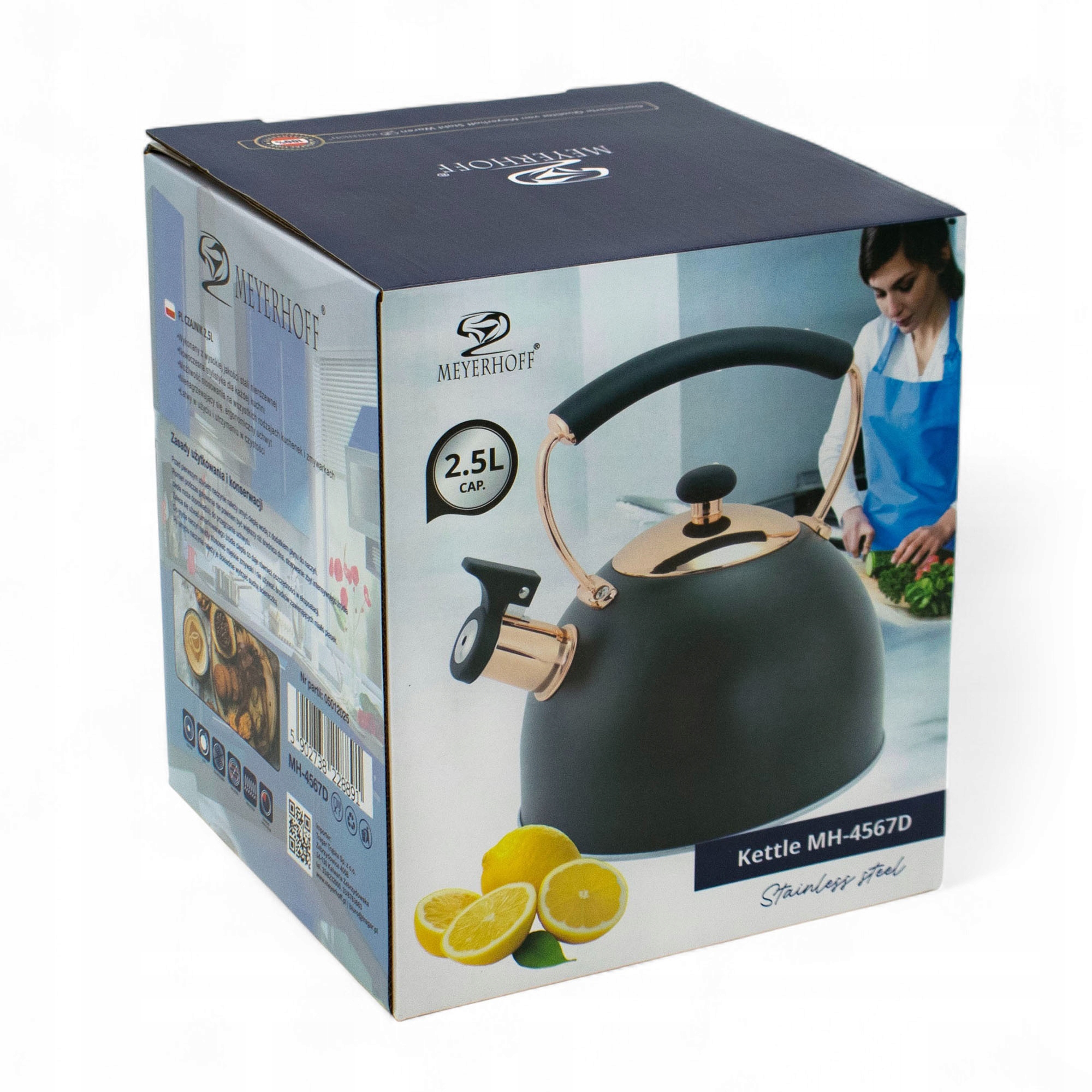 Чайник Meyerhoff виготовлений з високоякісної нержавіючої сталі гарантує тривале і безпечне використання. Дно чайника забезпечує рівномірний розподіл тепла, економлячи енергію. Підходить для всіх типів плит, включаючи індукційні. Має зручну пластикову ручку, що не нагріваєтьсяі свисток, що повідомляє про закипання води.