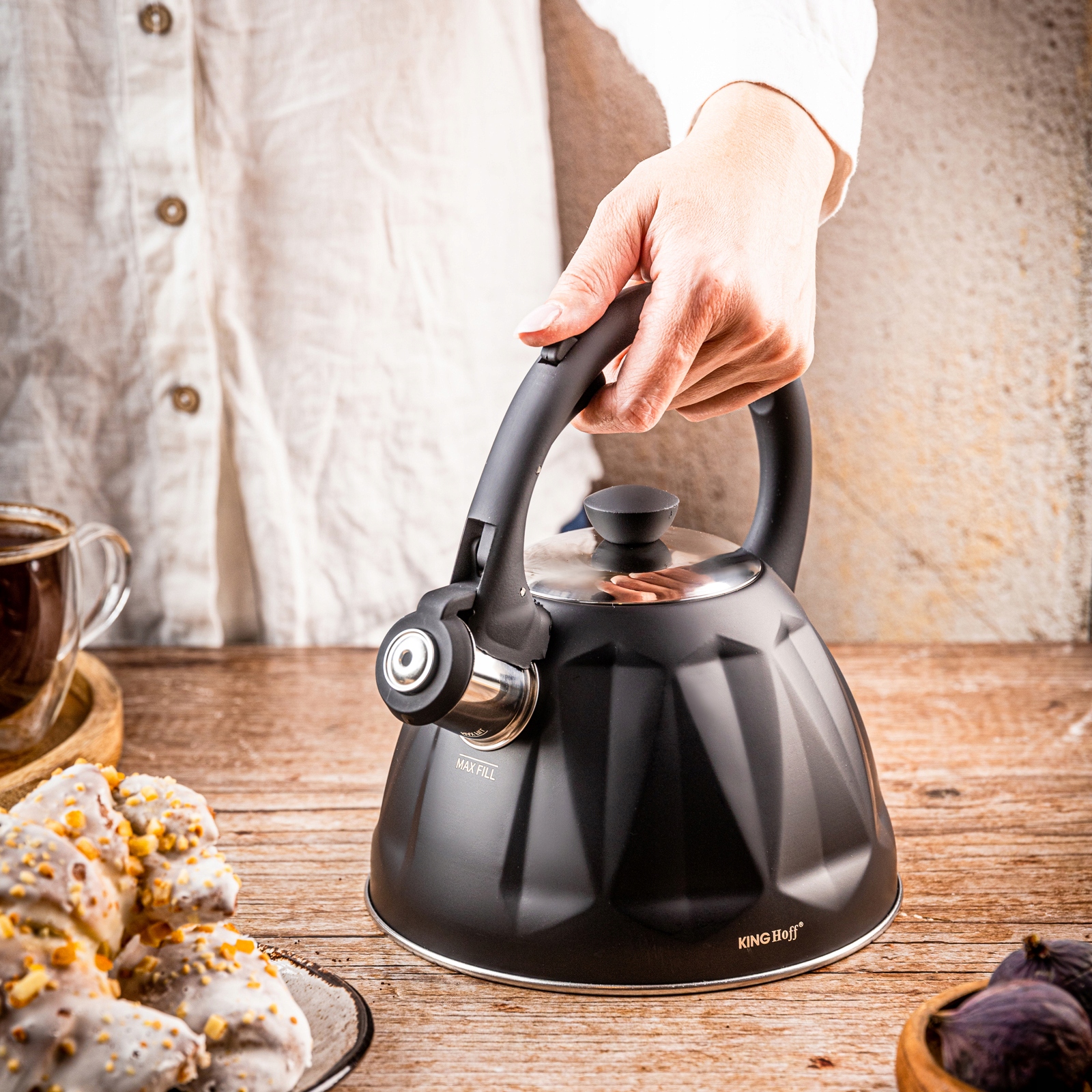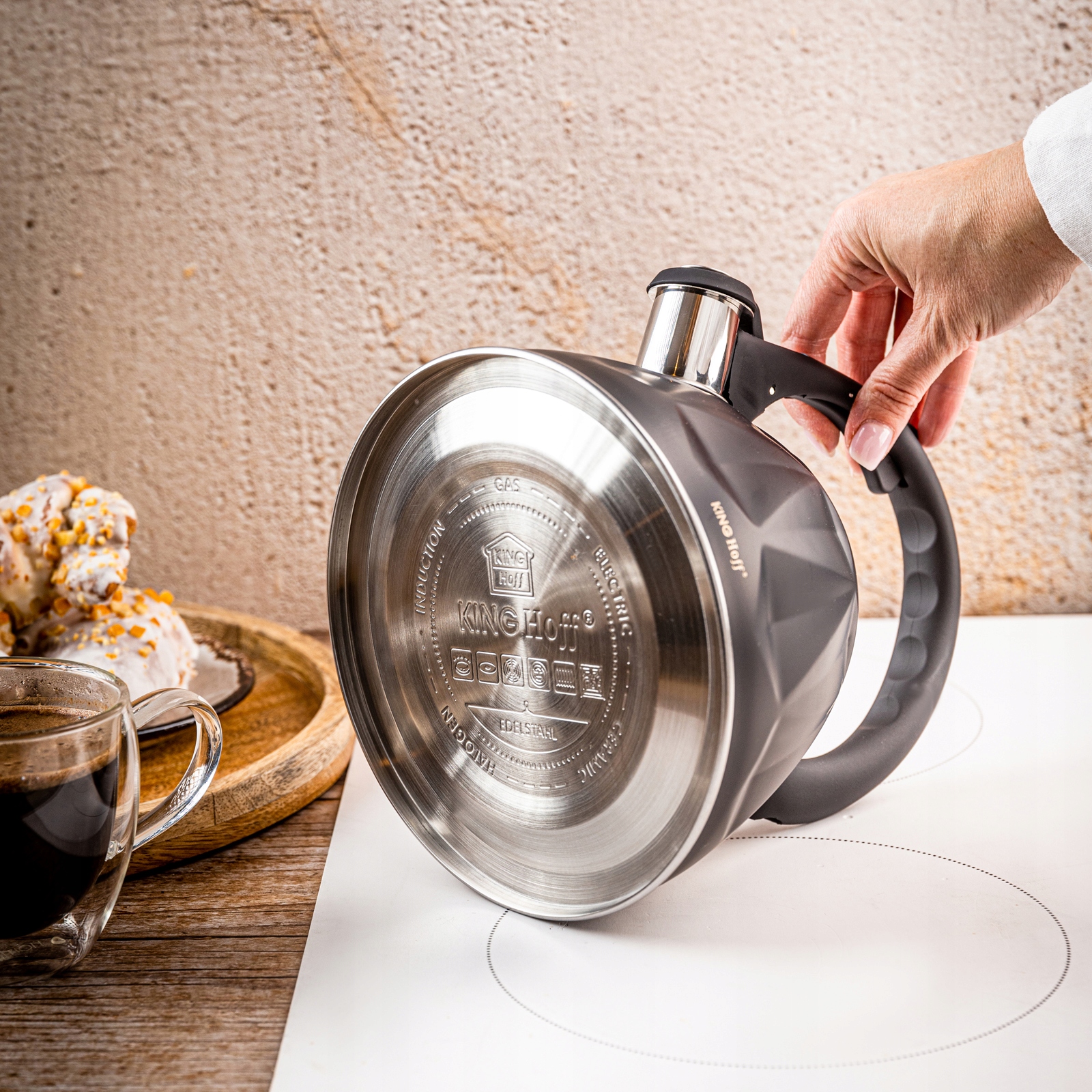 Чайник KINGHoff 2л зі свистком, газова індукція, нержавіюча сталь, чорний