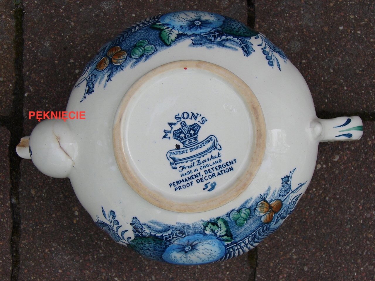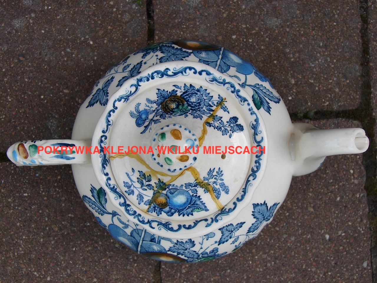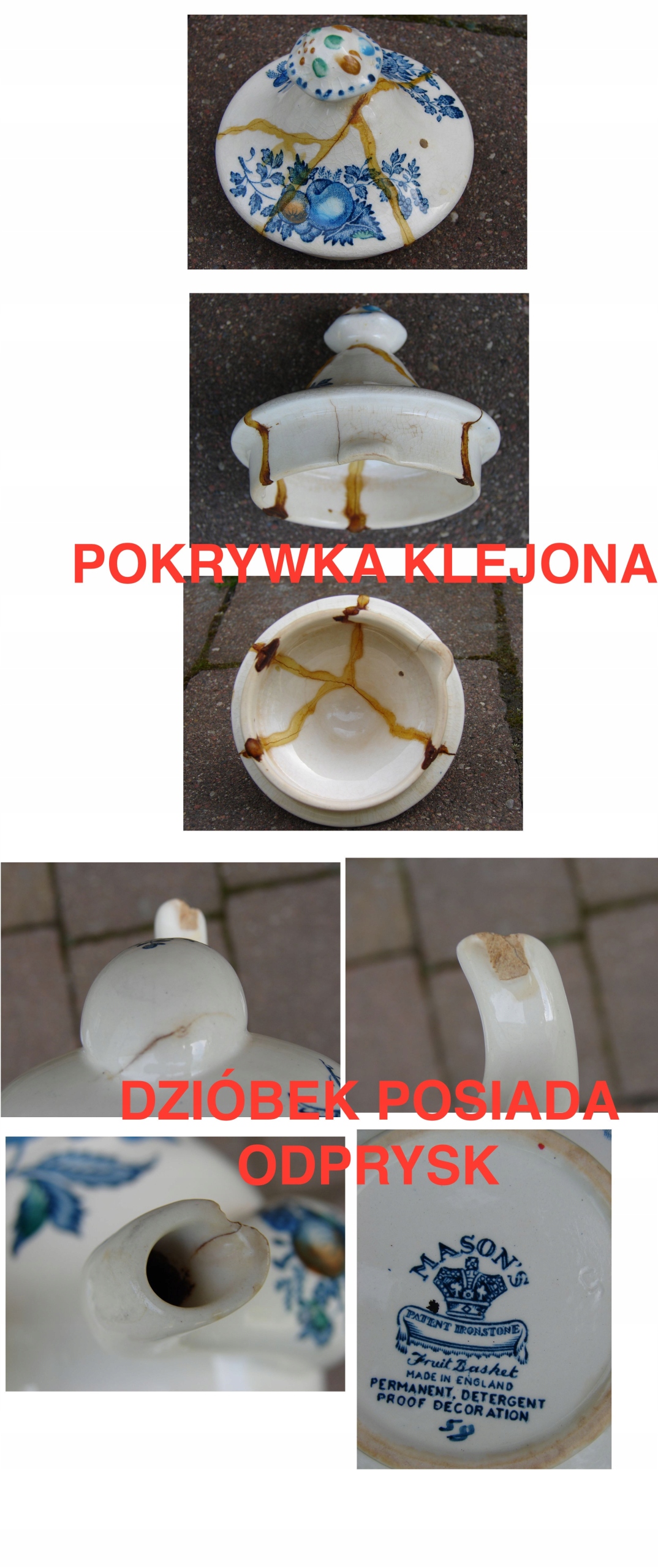 Кришка заклеєна в кількох місцях, носик наливника має скол і волосяну тріщину.