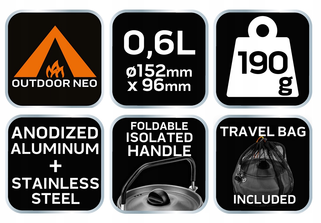 Чайник туристичний 0,8 л 63-147 фірми NEO об'ємом 0,8 л має розміри 152 мм в діаметрі і 96 мм у висоту. Виготовлений з анодованого алюмінію та нержавіючої сталі, він не тільки міцний, але й легкий. Його вага складає всього 190 г, оснащений складною ізольованою ручкою і кришкою з отворами. Це дозволяє готувати воду на відкритому повітрі, незалежно від умов. Має сертифікат LFGB про контакт з харчовими продуктами. Пропонується в комплекті зі зручною сумкою для транспортування. Торгова марка NEO рекомендована фанатам виживання.