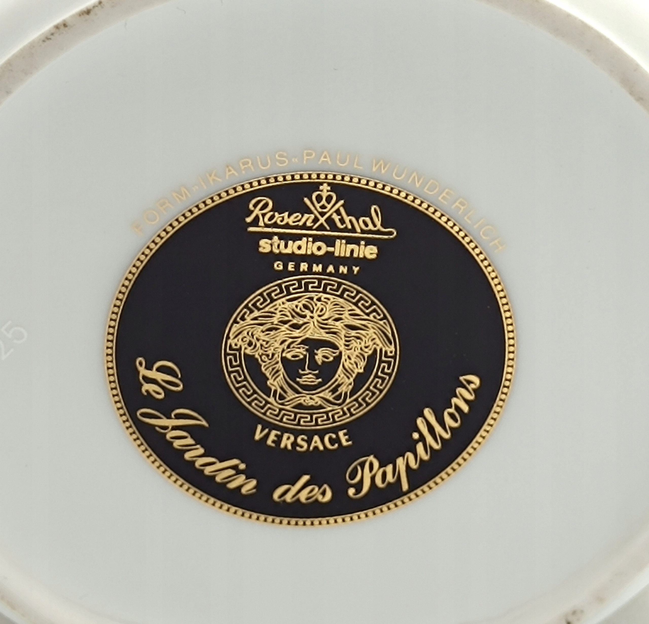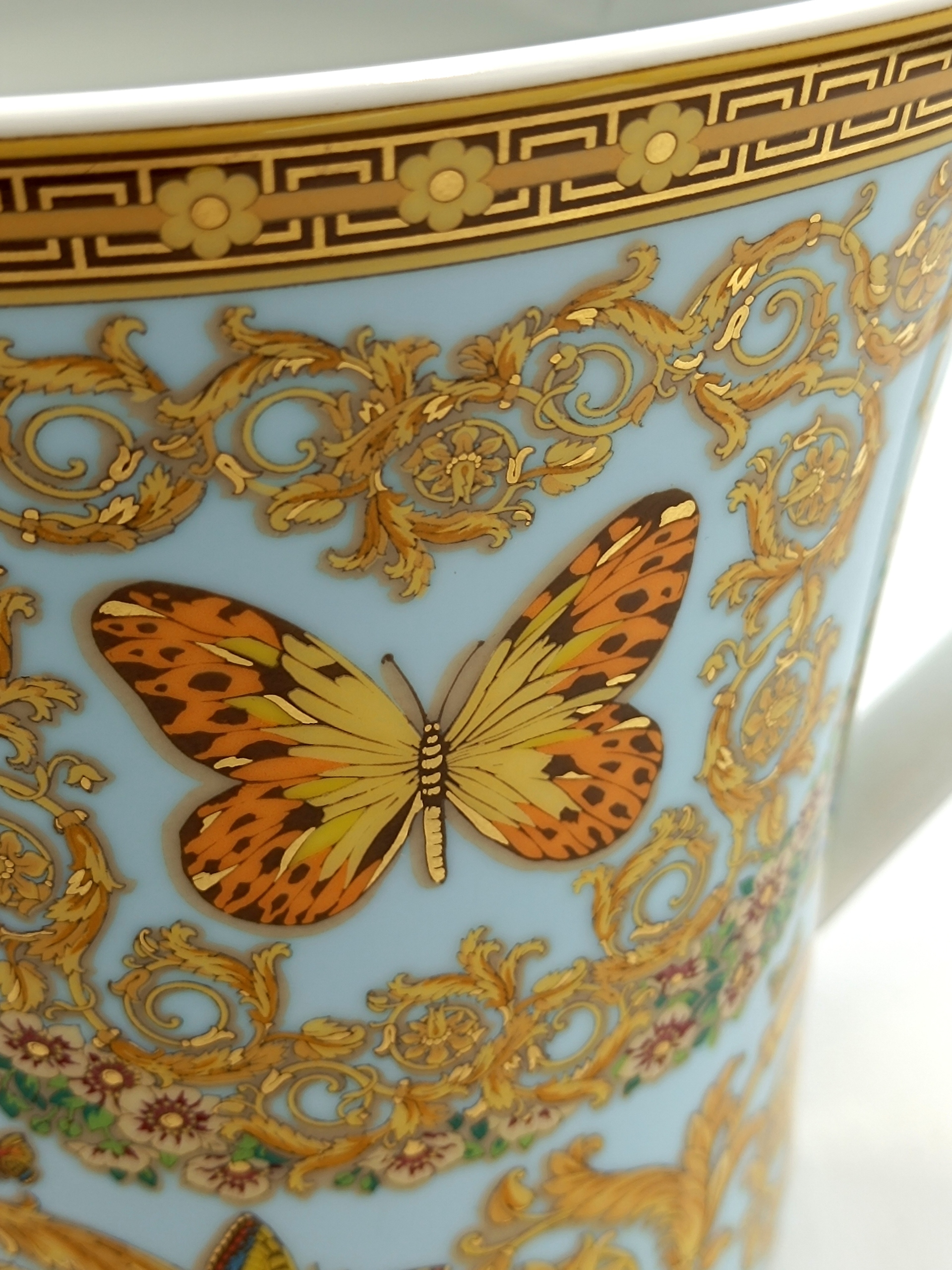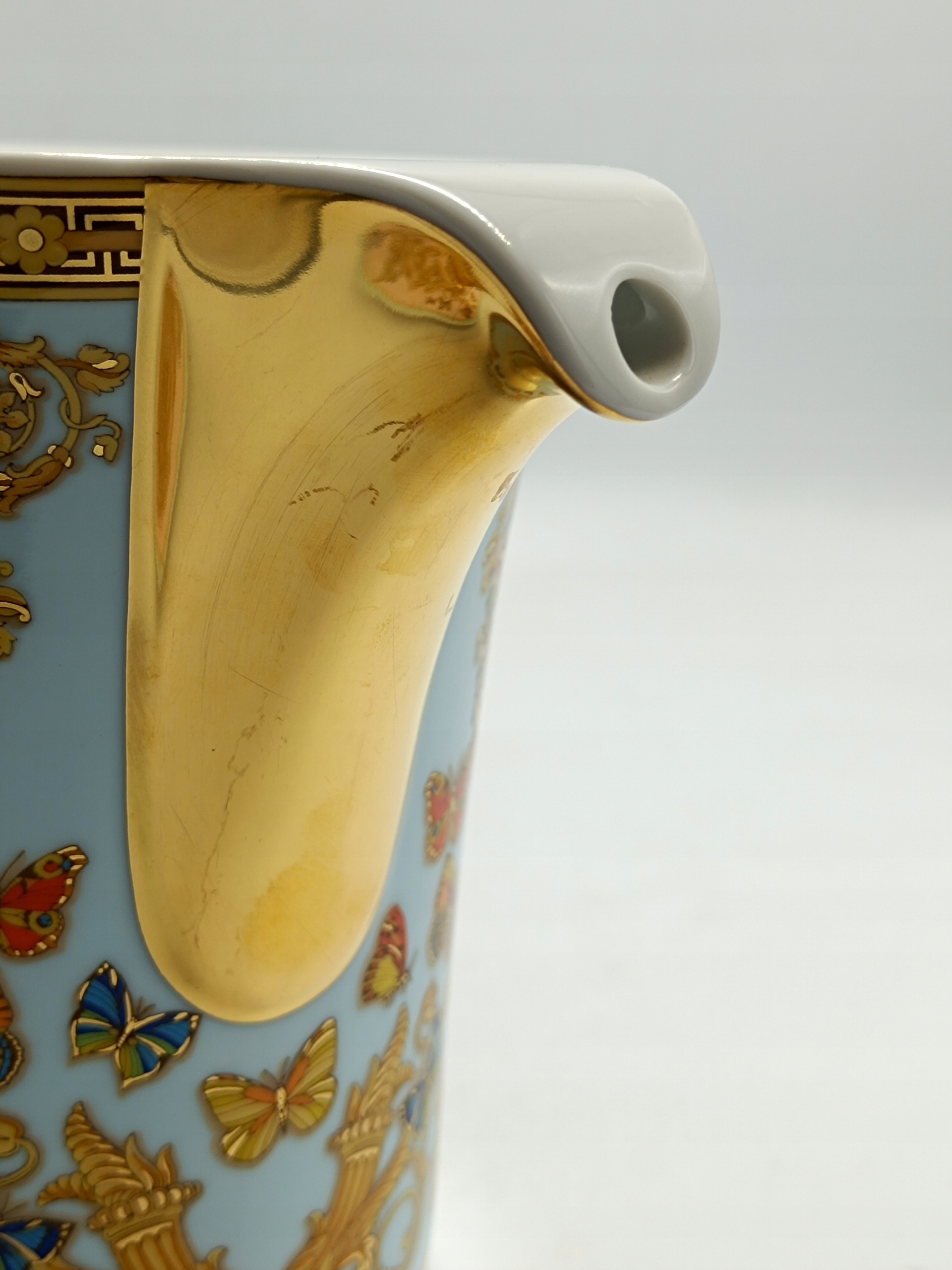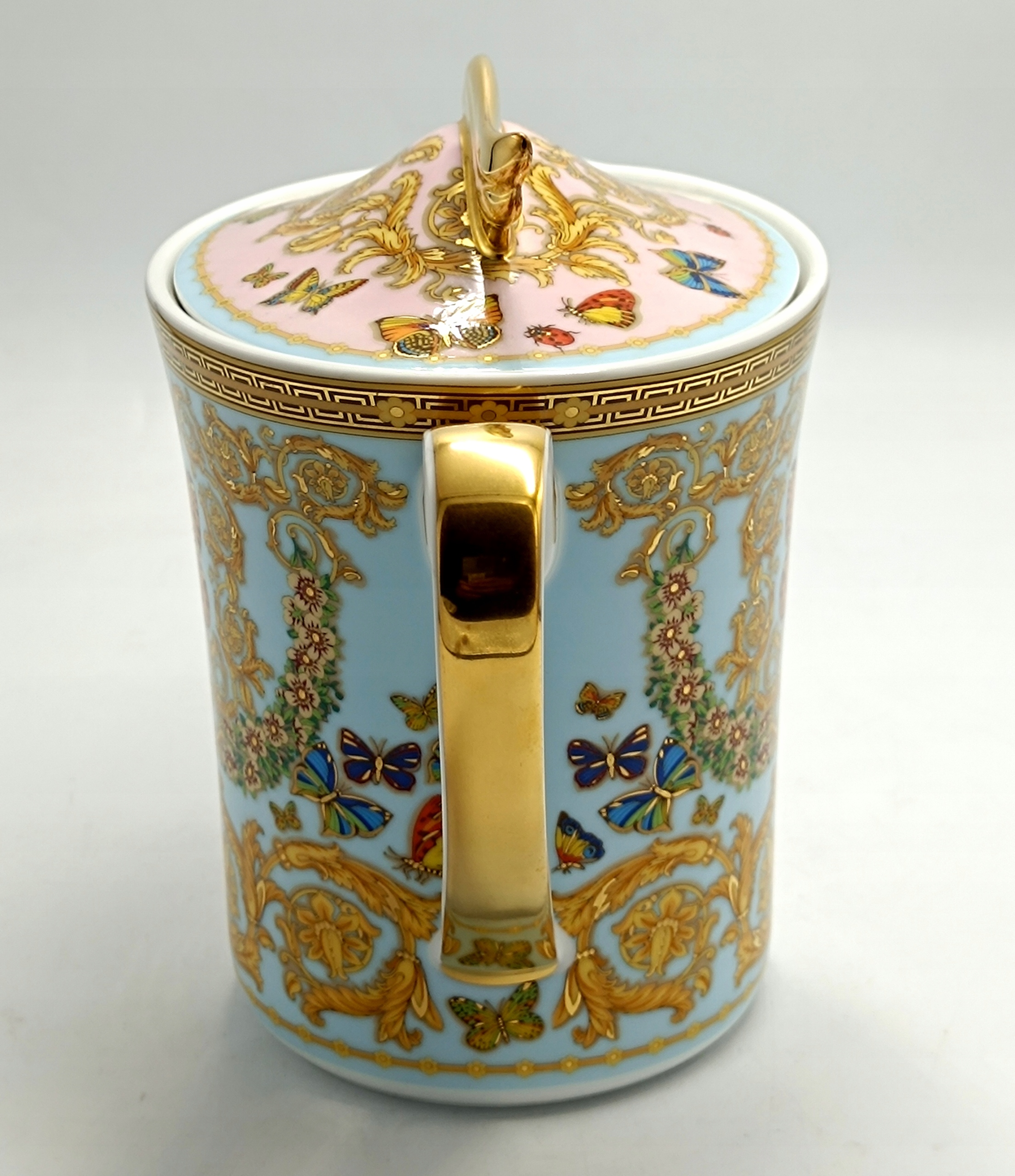 Глечик виготовлений з білої порцеляни найвищої якості у формі IKARUS від Paul Wunderlich. Le Jardin des Papillons – декор саду метеликів, безперечно, один із найкрасивіших спільних проектів. Ніжні кольори блакитного і рожевого ідеально гармонують з численними позолотами. Квіткові мотиви в поєднанні з різнокольоровими красивими метеликами різного розміру виглядають настільки казково, що від цього глечика неможливо відвести погляд. По верхньому краю характерний для Versace зигзаг з доповненнями дрібних квітів. Кришка глечика злегка опукла і закінчена чудовою, позолоченою, характерною ручкою у вигляді крила, яка радуватиме око. Ручка глечика дуже зручна у використанні, зовні прикрашена золотом. Глечик підписаний на денці. Він стане чудовим подарунком на будь-яке свято, стане неймовірно ефектною прикрасою для вашого сайту, а користуватися ним – суцільним задоволенням.