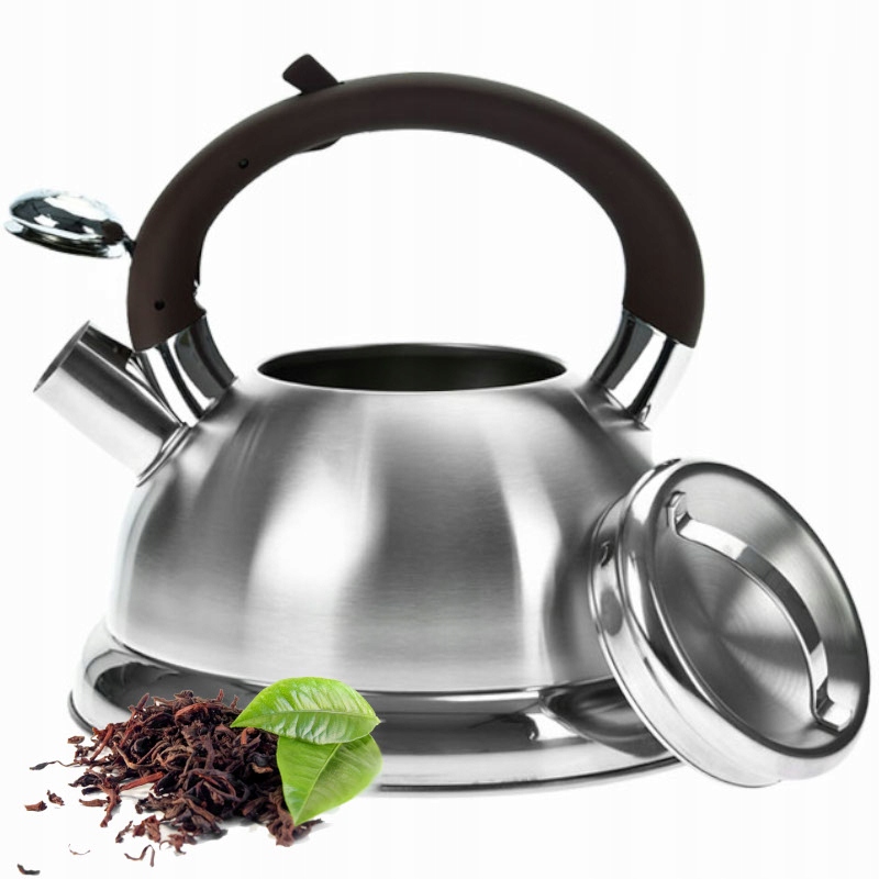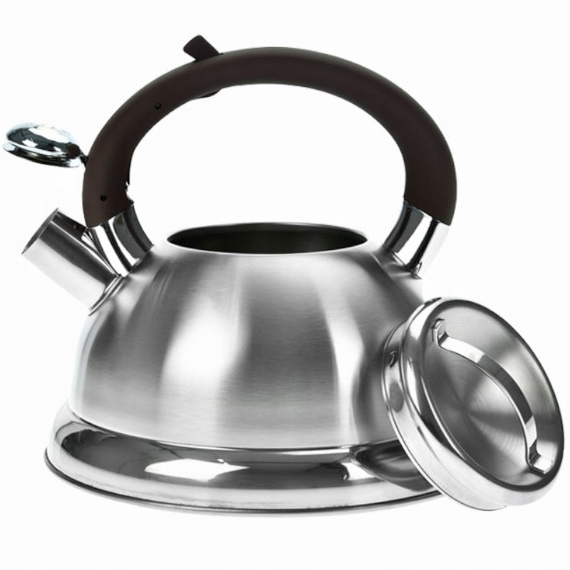 Традиційний чайник зі свистком. Виготовлений з високоякісної нержавіючої сталі та пластику. Дно чайника дозволяє використовувати його на всіх типах плит.