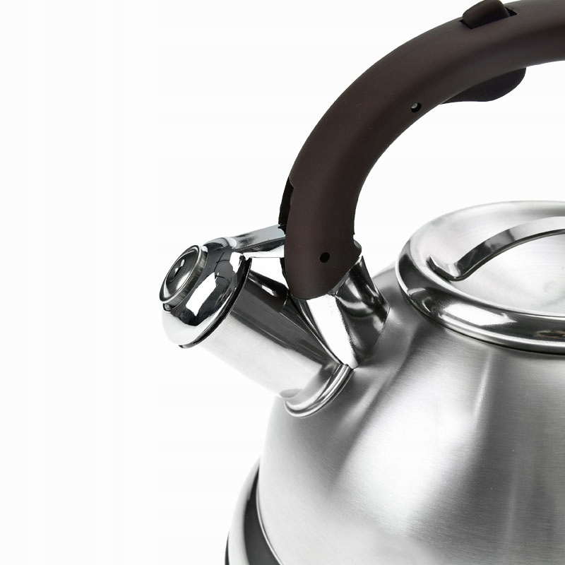 Чайник має ергономічну та не нагрівається ручку коричневого кольору. Виготовлений з пластику найвищої якості. Крім того, чайник має гучний свисток, який повідомляє, що вода закипає.