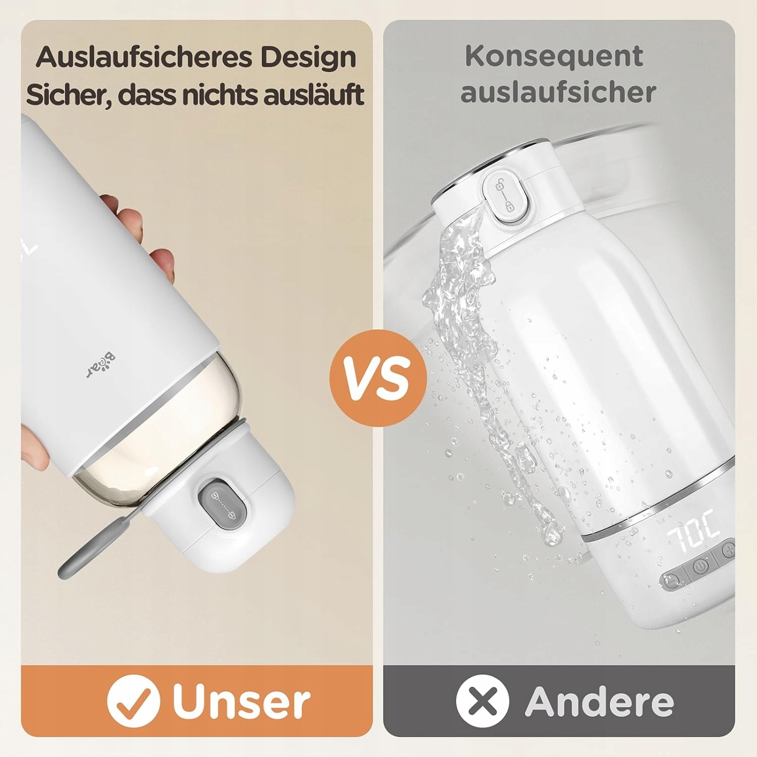 - 【Безпечна та герметична конструкція】: виготовлений із тритану, що не містить бісфенолу А, із нагрівальною пластиною з нержавіючої сталі 316, цей дорожній чайник невеликий, безпечний, не має запаху та не становить небезпеки для здоров’я. Герметичний дизайн ефективно запобігає витокам і робить його надійним вибором для батьків, які часто подорожують.