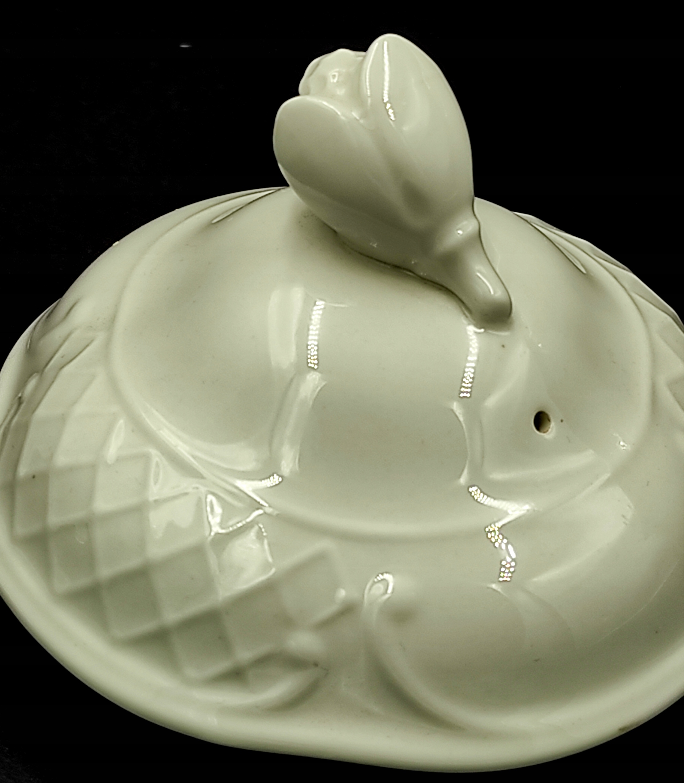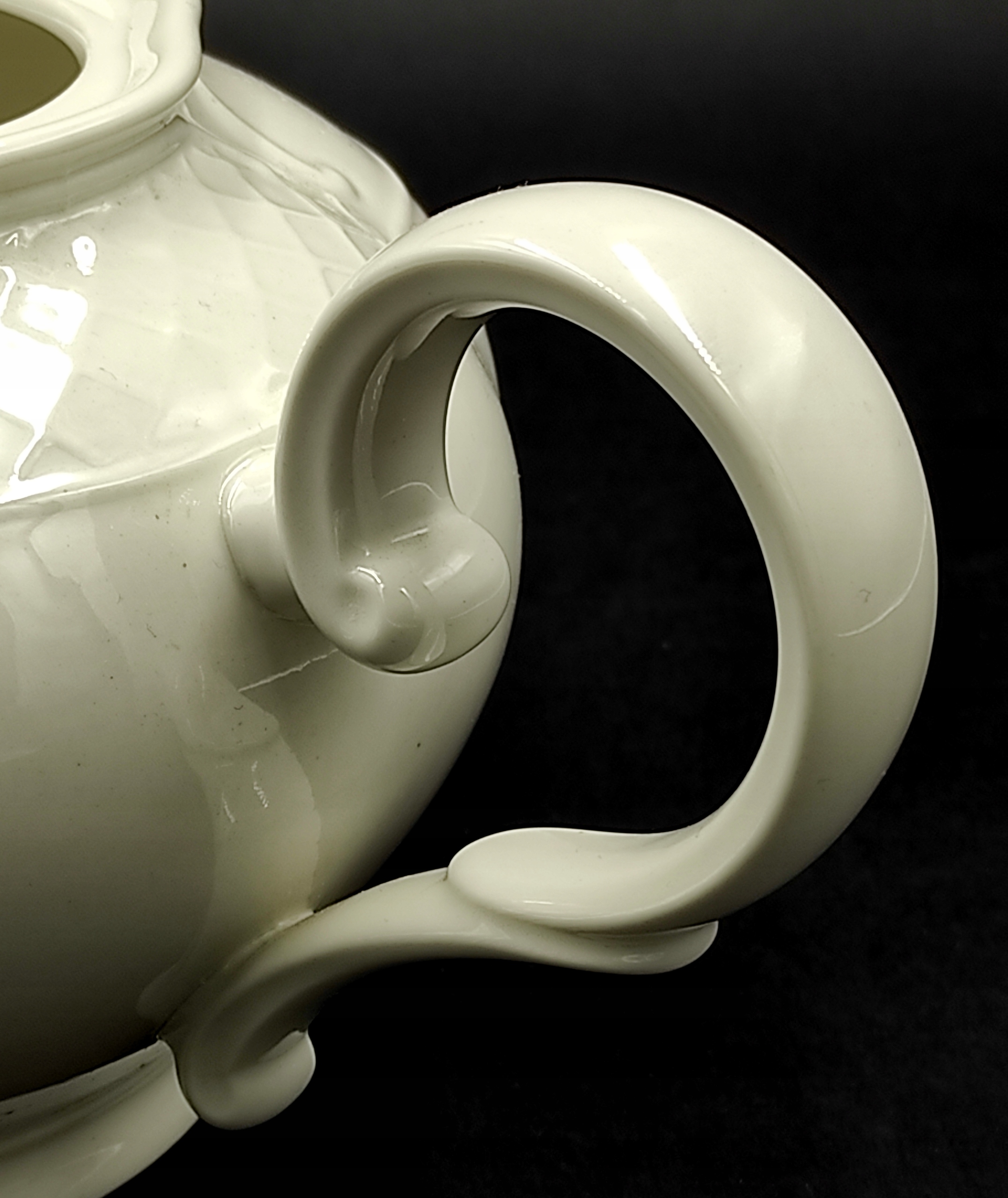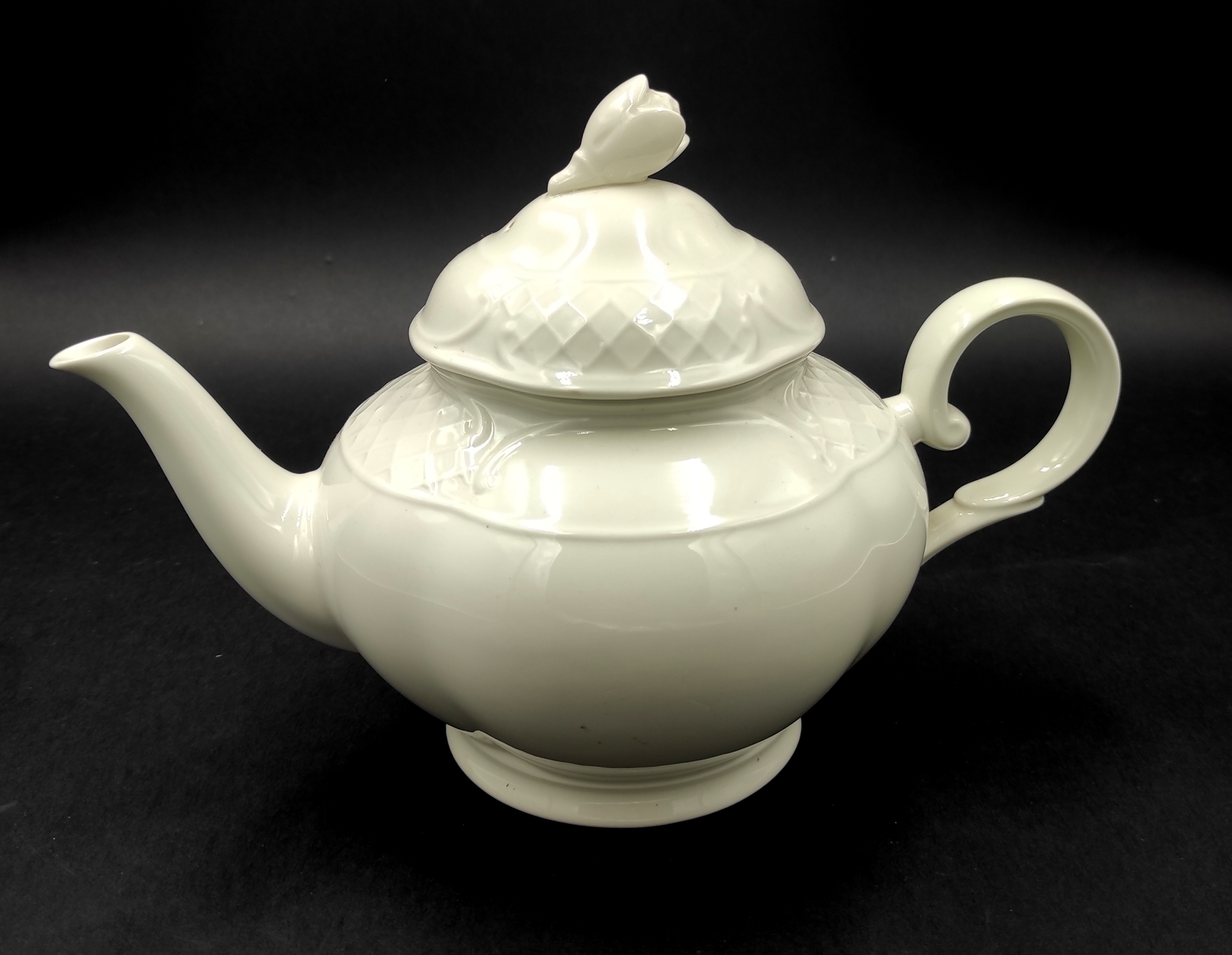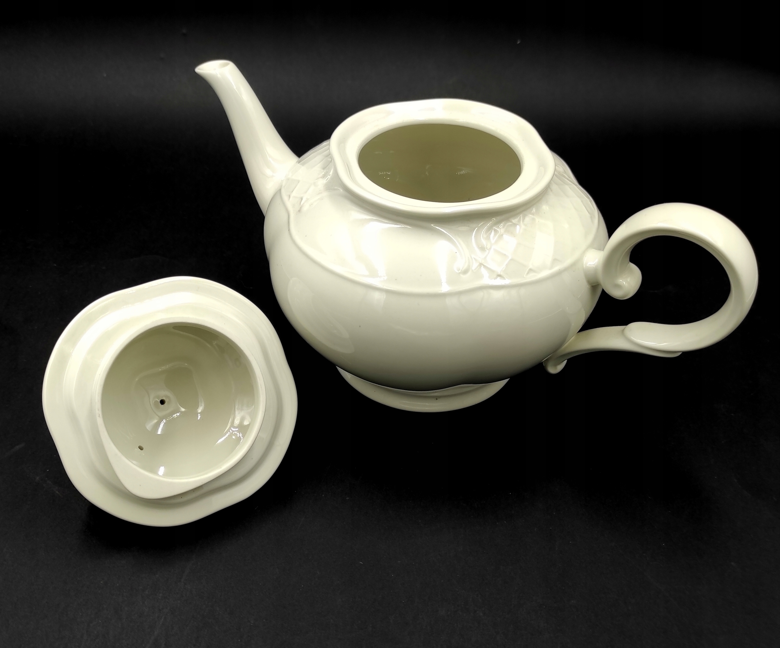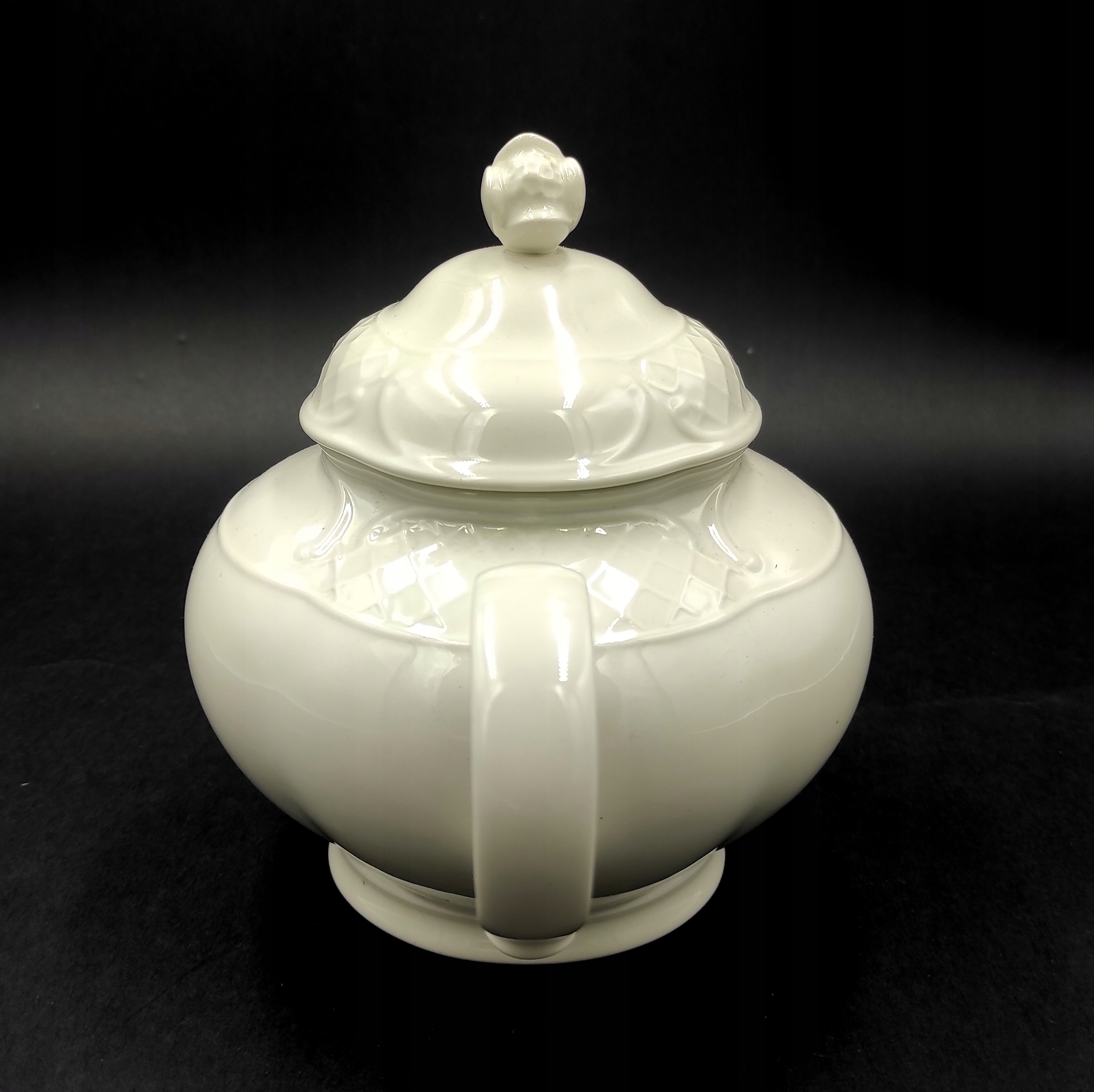 Виготовлена з високоякісної білої порцеляни VITRO. Має красиву опуклу форму зі зручною ручкою і тонкою лійкою. Кришка увінчана красивим бутоном квітки. Додатково він у кількох місцях прикрашений «опуклою сіткою», яка здалеку нагадує мереживо. Його можна мити в посудомийній машині.