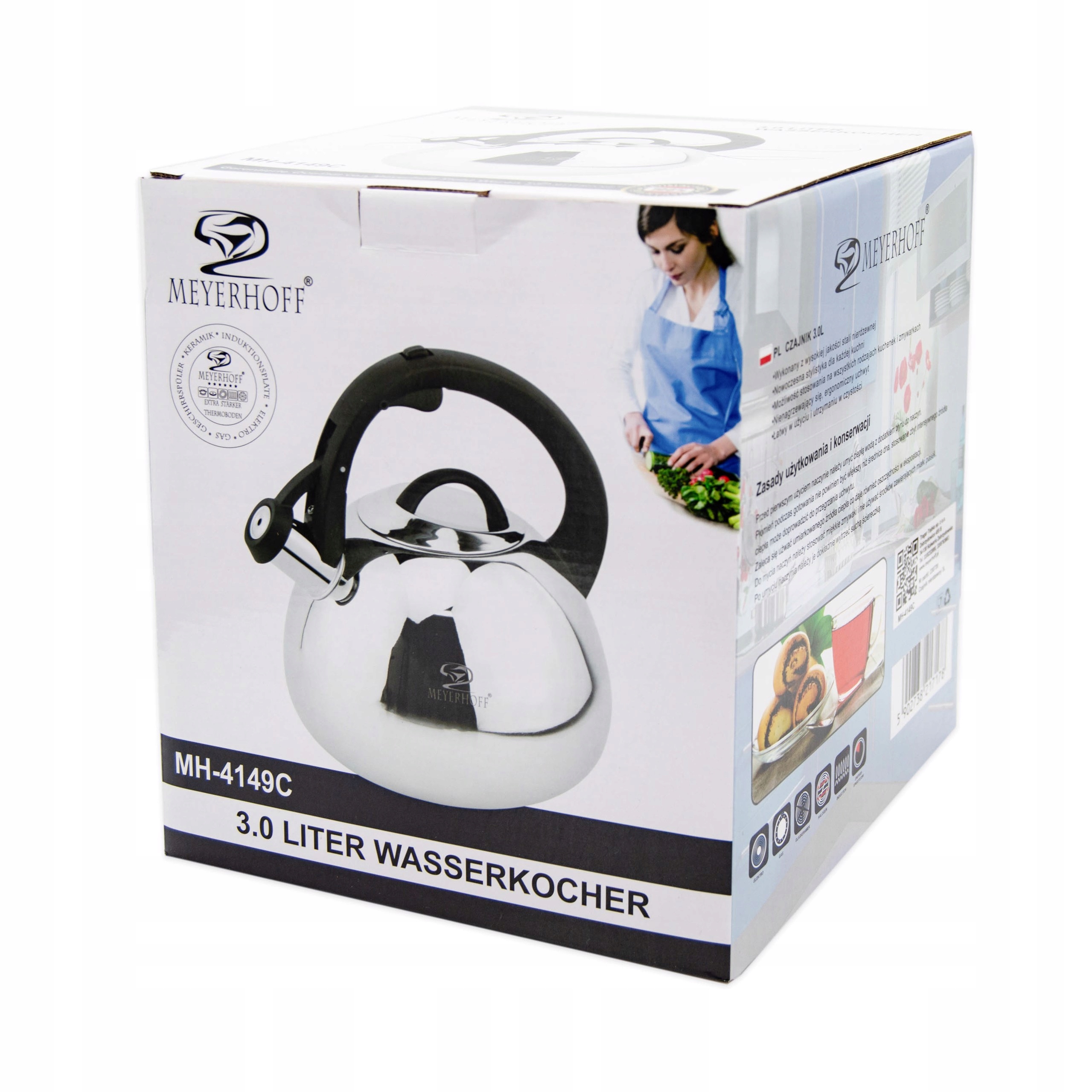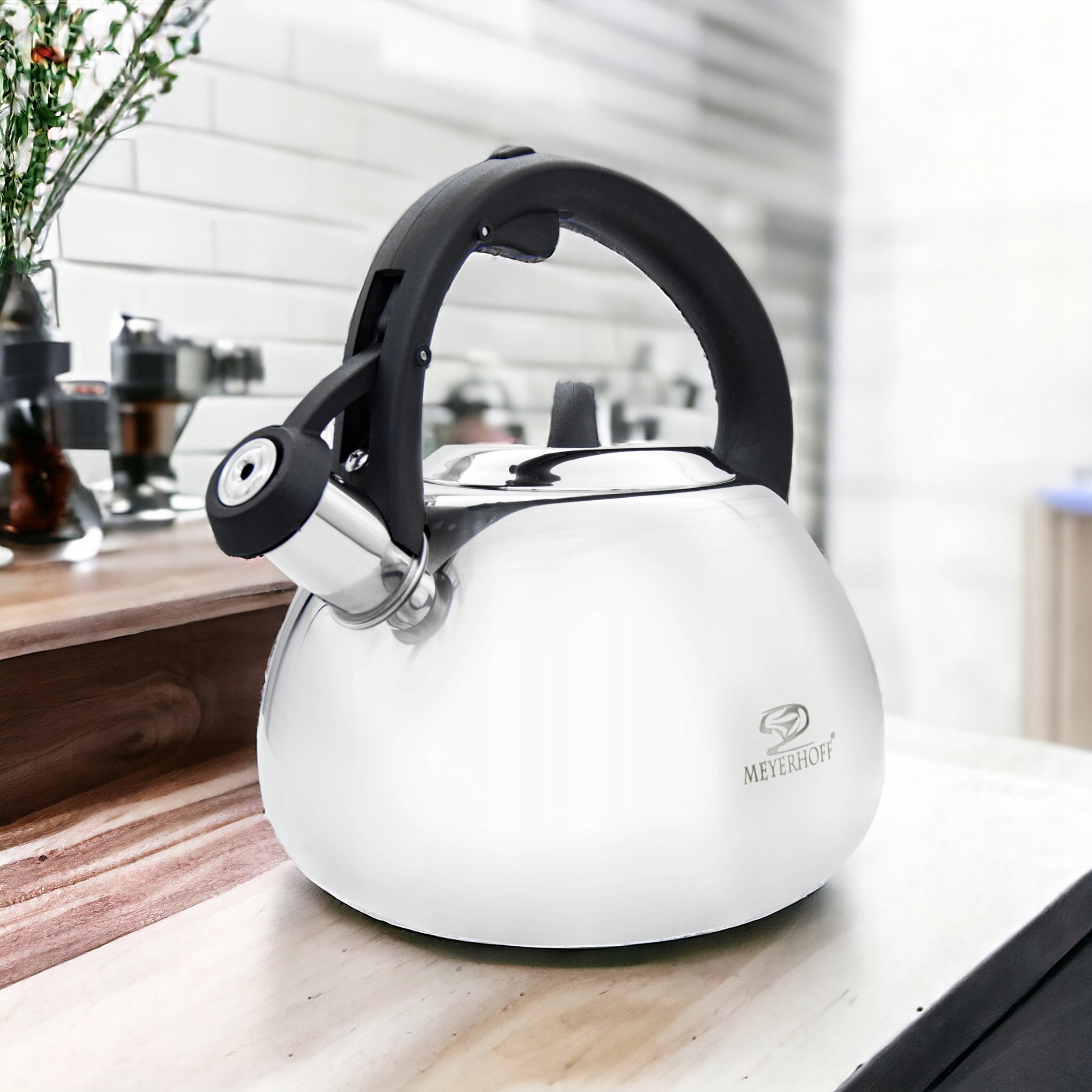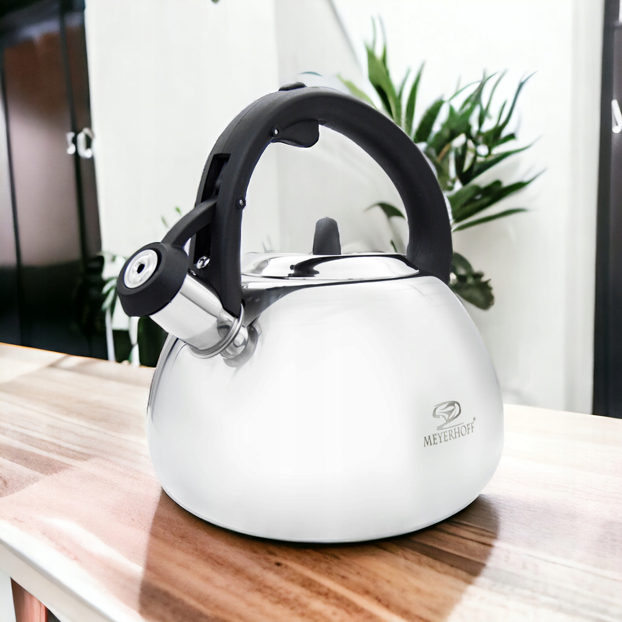 Чайник Meyerhoff виготовлений з високоякісної нержавіючої сталі. Дно чайника забезпечує рівномірний розподіл тепла, заощаджуючи енергію. Підходить для всіх типів плит, включаючи індукційні. Має зручну ручку, що не нагрівається та свисток, що повідомляє про закипання води.