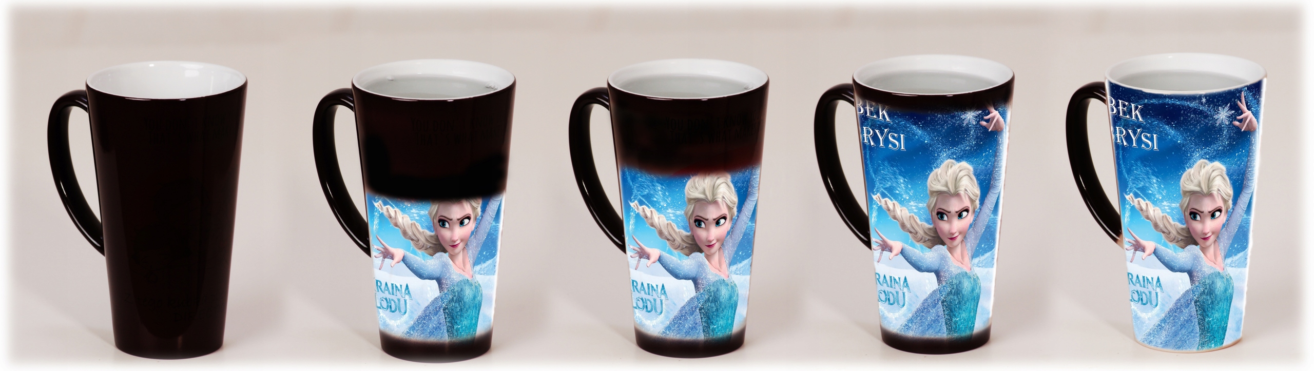 Холодна чаша чорна. Після наливання гарячого напою зображення на кухлі повільно розкривається.