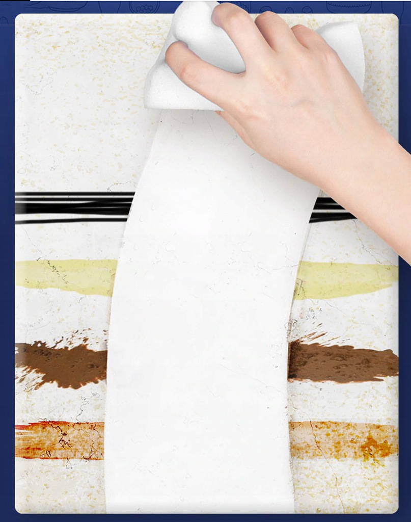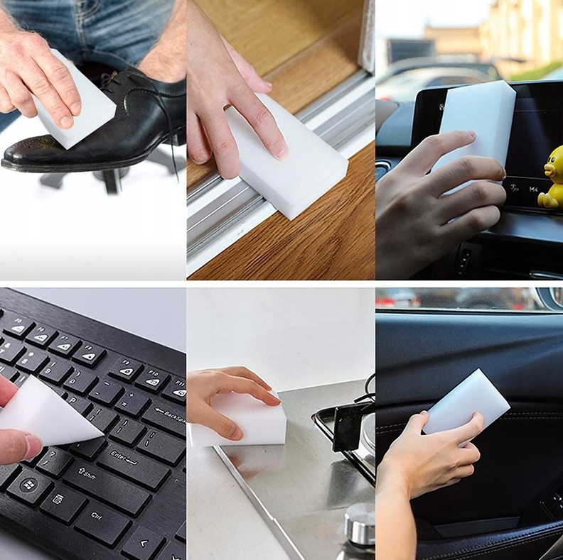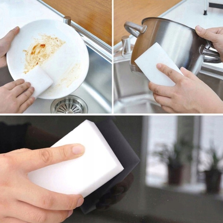 Губка складається з меламінової піни, яка стає м’якшою під впливом вологи. Щільна структура піни дозволяє видалити навіть складні плями і забруднення з поверхні без використання додаткових засобів для чищення. Просто злегка змочіть губку та протріть нею місце з брудом.