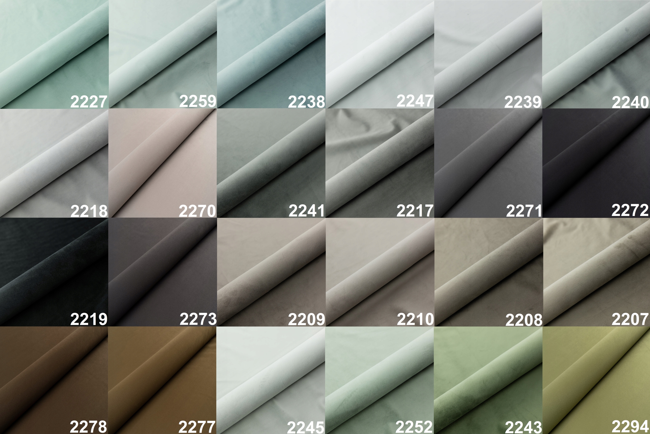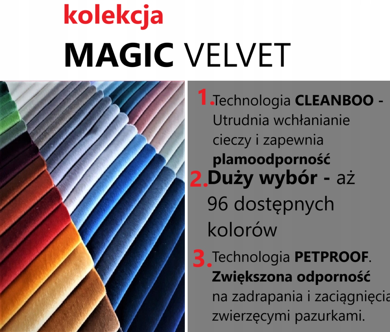 Magic Velvet пропонує найбільшу кількість кольорів серед доступних тканин на ринку, в яких він має соковиті кольори, які введуть велику дозу енергії в інтер'єр. Кольори, що використовуються ідеально поєднуються з текстурою матеріалу, яка приємна і м’яка на дотик і має характеристику оксамиків глос . Оксамитові тканини чудово виглядають на наших меблях. Крім того, колекція Magic Velvet має високу стійкість до механізму , що змушує тканину тривалий час зберігати свої естетичні значення .