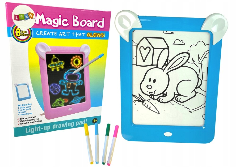 Як почати грати? У набір входять шаблони для письма та малювання. Просто виберіть один із них, помістіть його всередину дошки та почніть обводити фігури за допомогою ручок, що входять у набір. Закінчивши, замініть блокнот на чорний, натисніть кнопку, і ваші малюнки засяють кількома світловими ефектами. Цей освітлюючий буквар подарує дивовижний ефект малюнку вашої дитини. Підсвічування може додатково підвищити привабливість ваших малюнків, і вони будуть чудово виглядати в затемненій кімнаті.