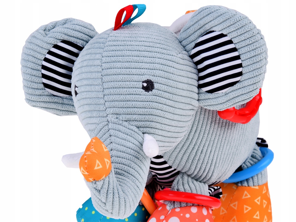 Усередині плюшевого слона є м’яч, який видає дзвіночок, коли його трясуть, забезпечуючи додатковий елемент веселощів і сенсорну стимуляцію. Черево слона прикрашене чорно-білими смужками з приємного на дотик матеріалу, а весь слон виготовлений із злегка складчастого матеріалу, який заохочує дитину хапати та досліджувати.